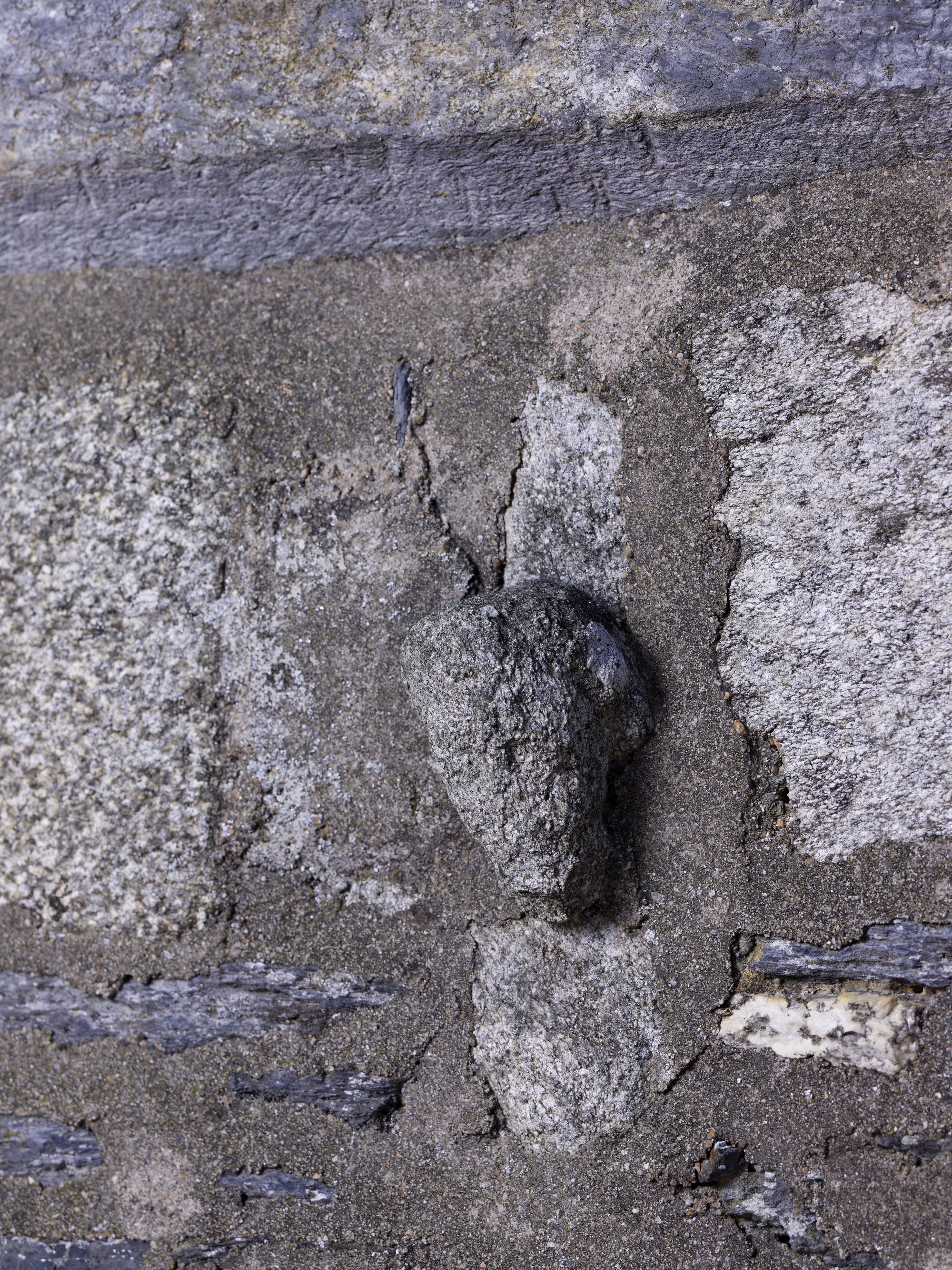 Transept, mur ouest du bras sud : partie supérieure d'un Christ en croix réutilisé (état en 2013)Immatriculation