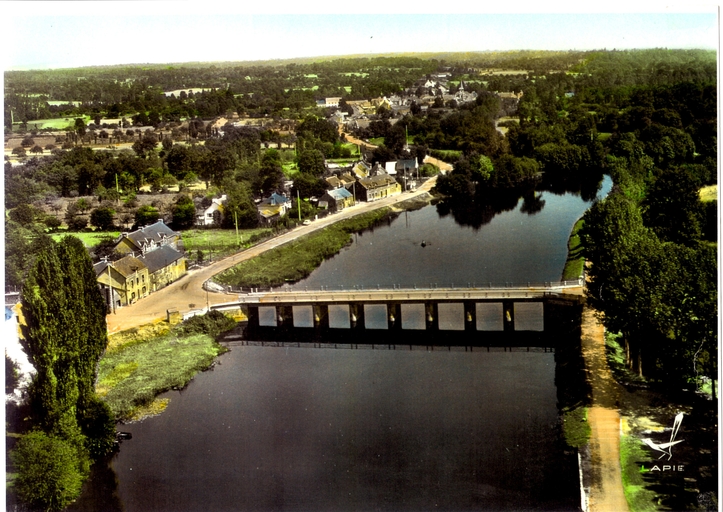 Le pont du Guélin et les maisons sur la rive gauche du canal : vue aérienne prise de l'ouest. Carte postale, vers 1950 (collection particulière)Immatriculation