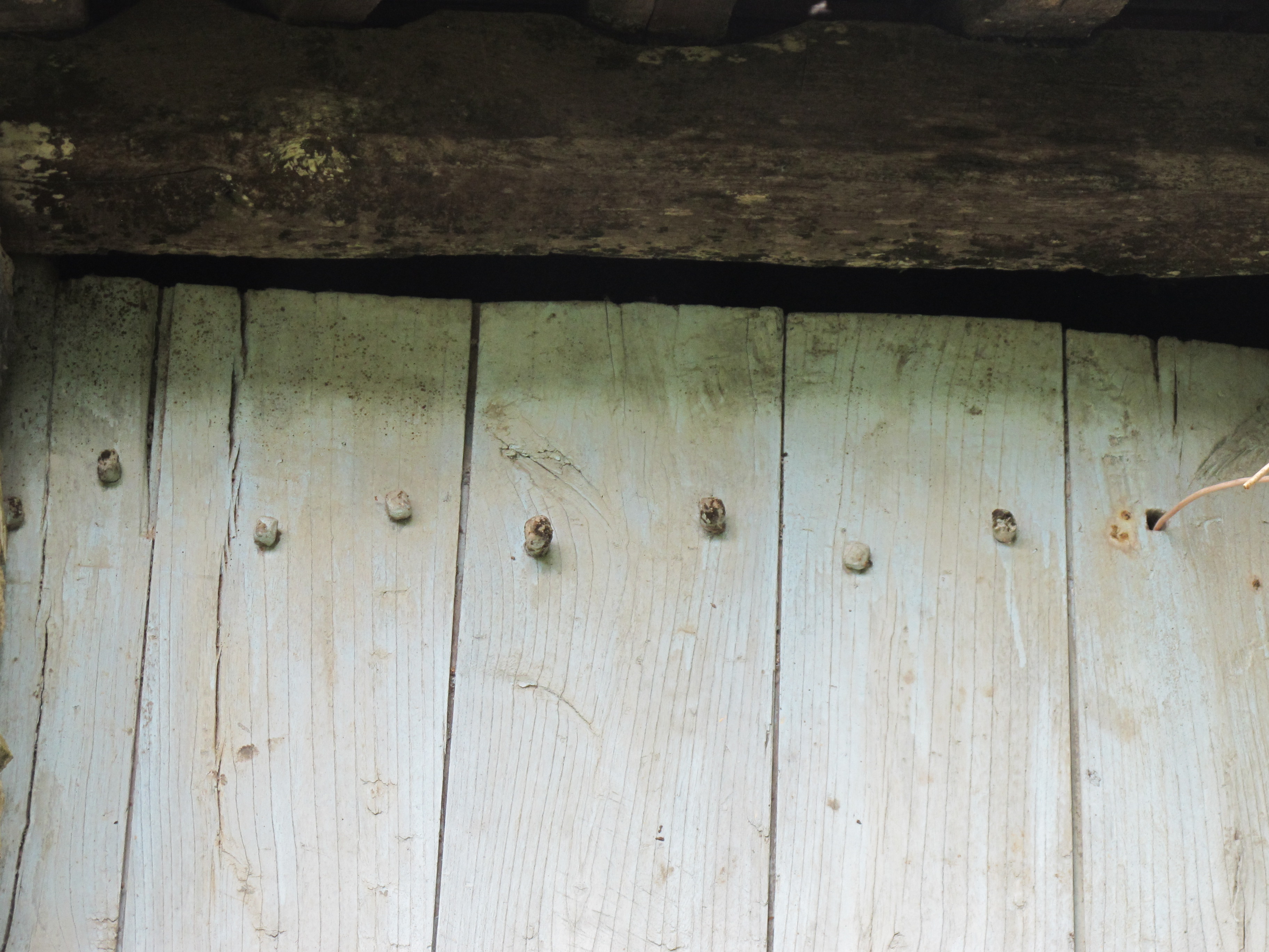 La Corbais, ferme 2, auj. maison : chevilles de bois taillées en pointe de diamant, qui permettent d’assembler les planches du volet de la lucarneImmatriculation