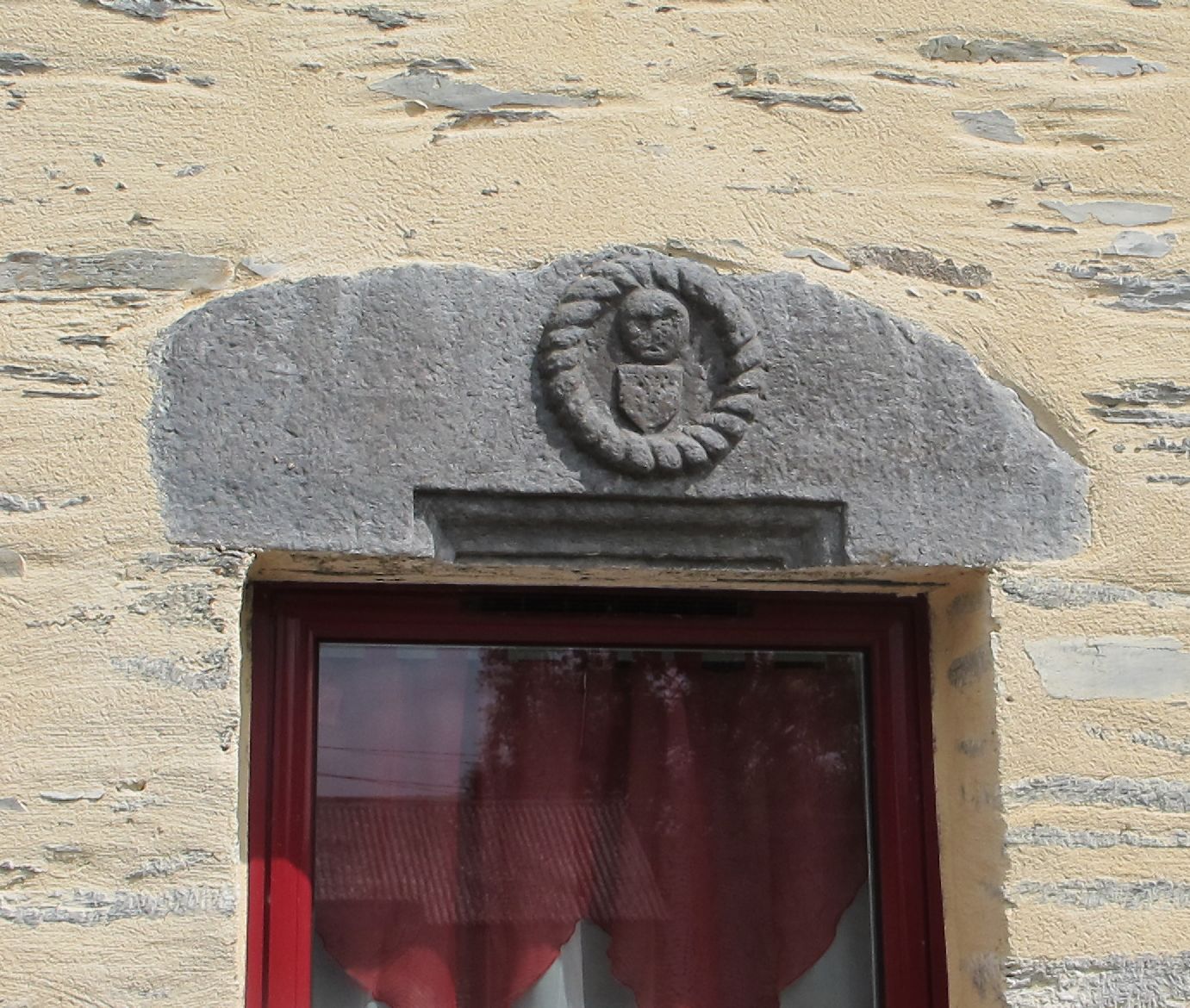 La Chenais, maison 3, linteau de fenêtre remployé au-dessus de la porte, décor en bas relief : tête et écu muet dans une cordelièreImmatriculation