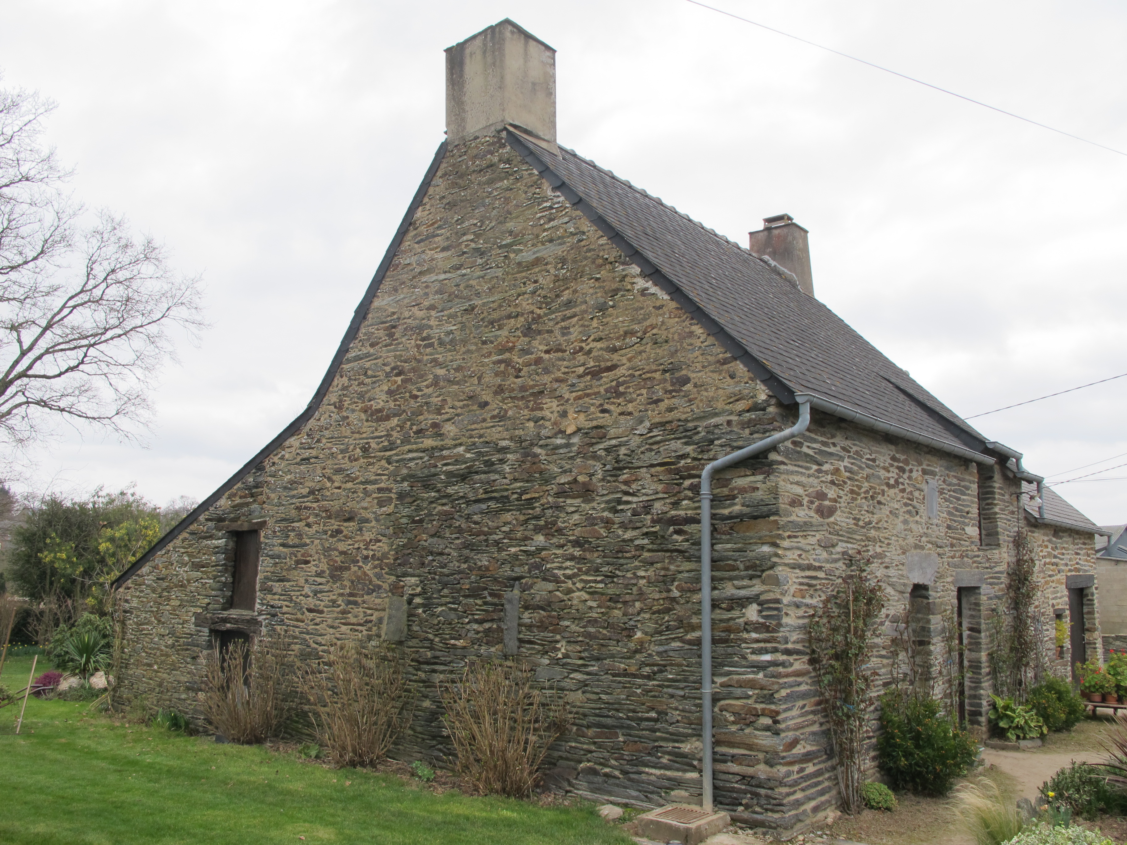Les Rues Noblet, ferme 1 : vue générale prise du sud-ouest ; sur la gauche, l'ancienne soue ; sur le mur pignon, sortie des consoles en schiste de la cheminée du logis (état en 2013)Immatriculation