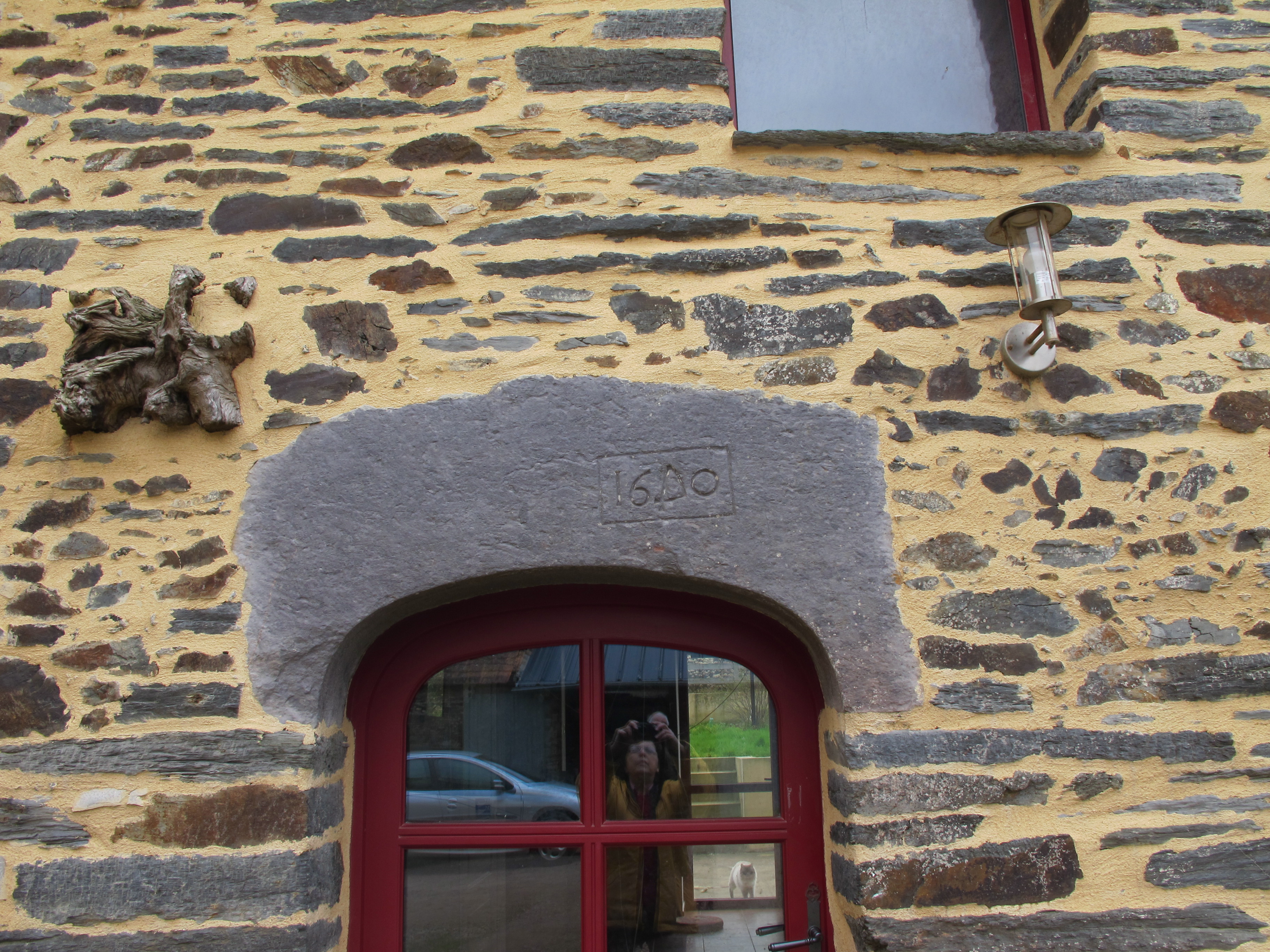 Les Rues Noblet, maison 3 : le linteau de la porte ; au-dessus à gauche, on distingue l'about d'une des poutres qui soutient le plancher (état en 2013)Immatriculation