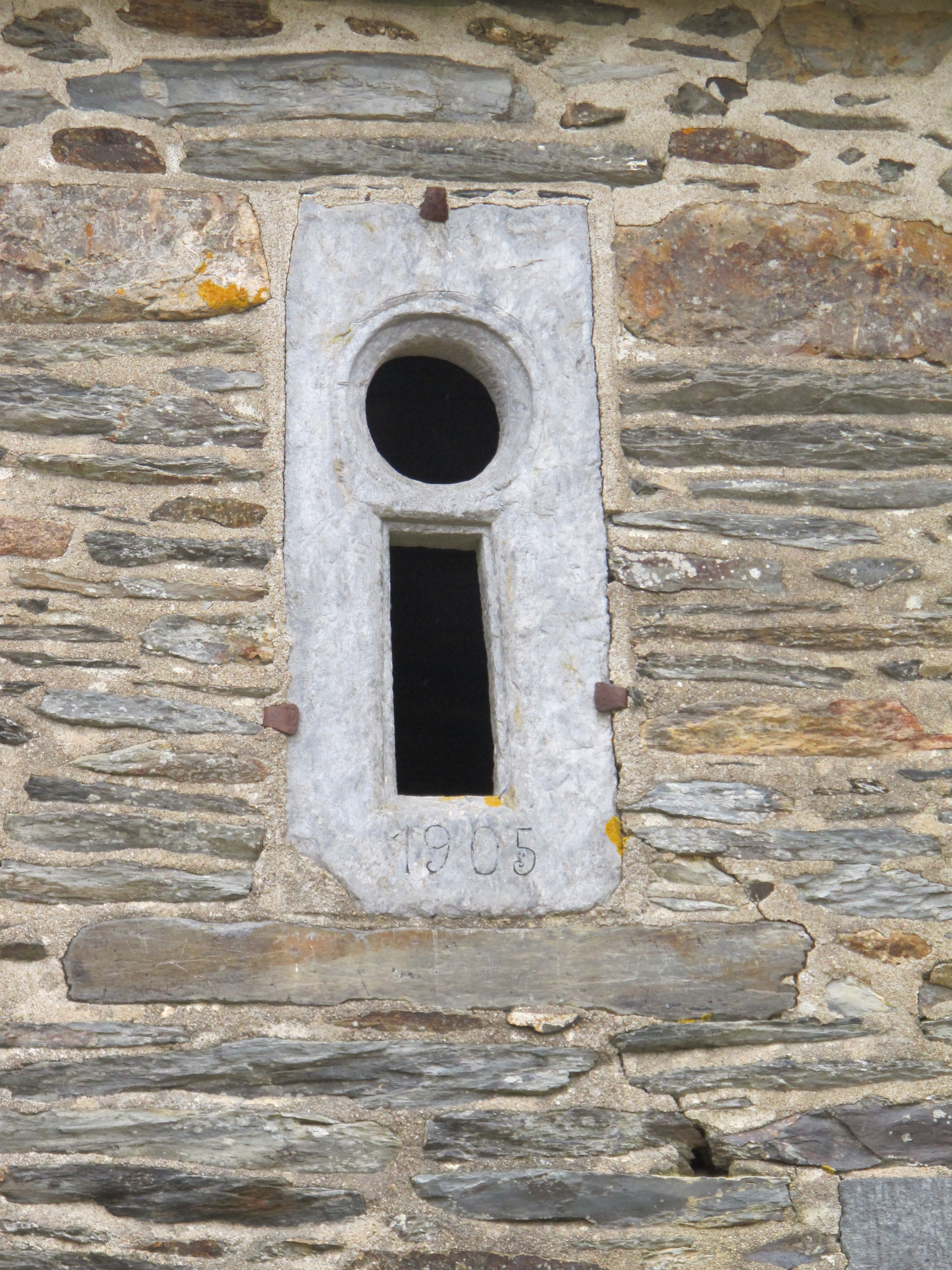 Les Rues Moisan, ferme 6 : bouche à feu (?) utilisée comme jour d'aération du comble ; elle est gravée de la date 1905 (état en 2013)Immatriculation