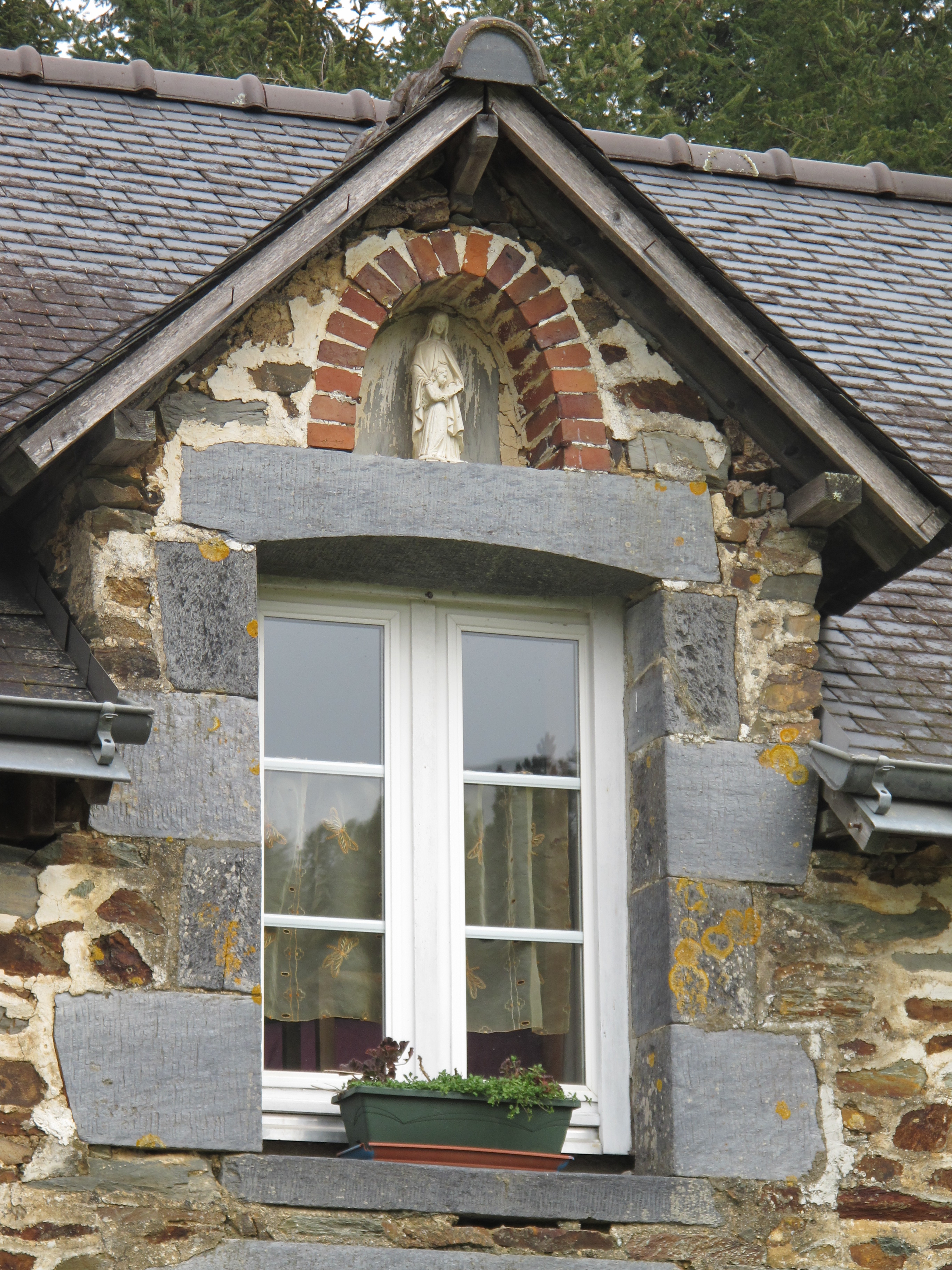 Ker Anna, maison : la lucarne surmontée d'une niche à statuette (état en 2013)Immatriculation