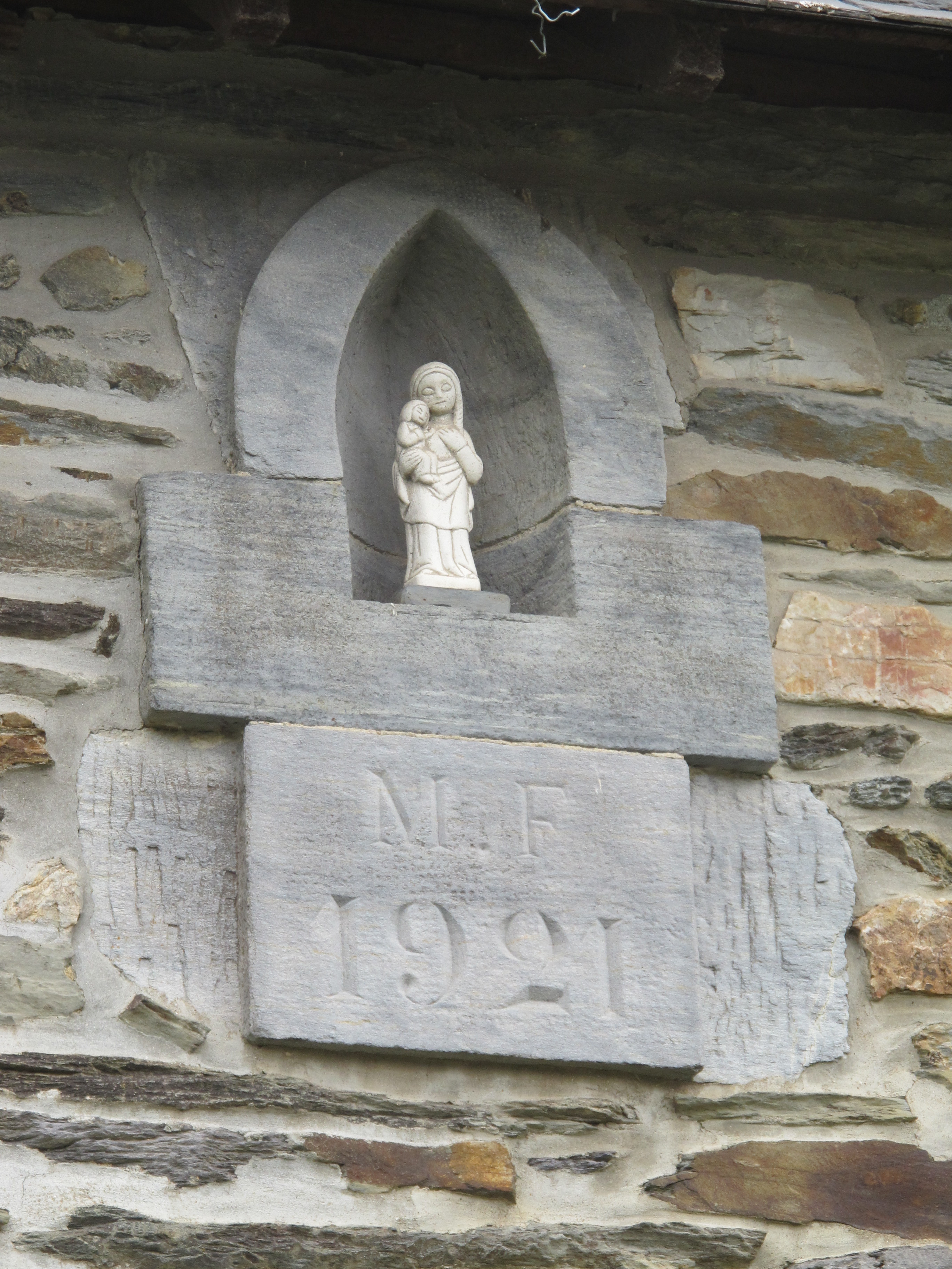 Les Rues Vonin, ferme, élévation sud : niche à statuette en schiste et inscription MF 1921 (état en 2013)Immatriculation