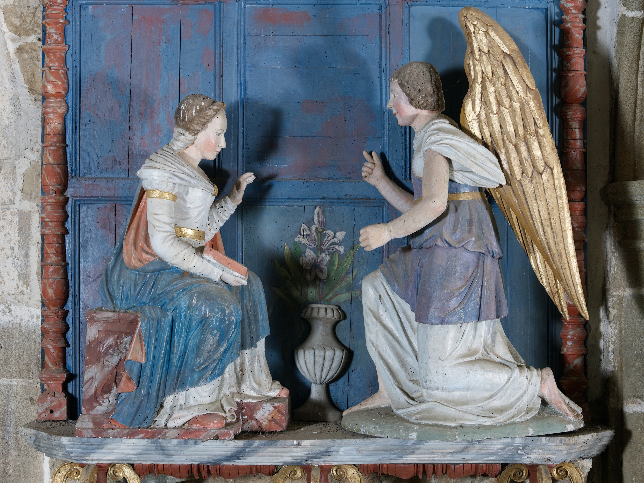 Ploubezre, chapelle de Kerfons : vue intérieure, détail du groupe sculpté représentant l'Annonciation faite à Marie. Ce groupe sculpté est daté du 16e siècleImmatriculation