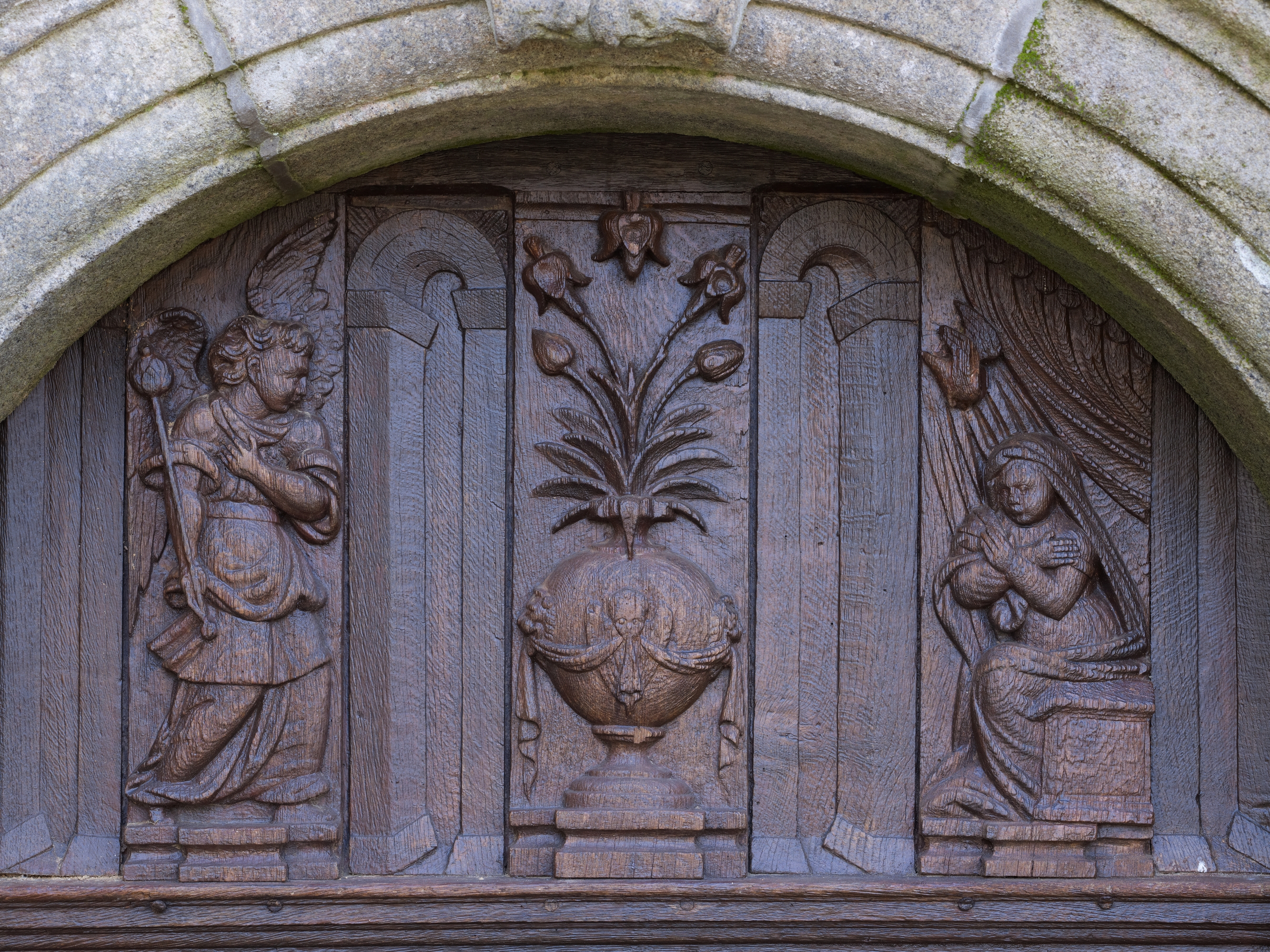 Ploubezre, chapelle de Kerfons : porte avec panneaux sculptés représentant l'AnnonciationImmatriculation