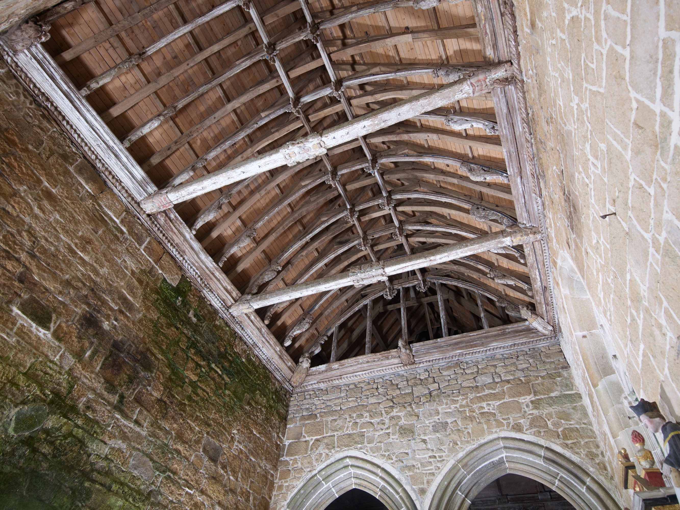 Ploubezre, chapelle de Kerfons : vue intérieure, charpente ancienne à entraits (engoulants), sablières et blochets sculptésImmatriculation
