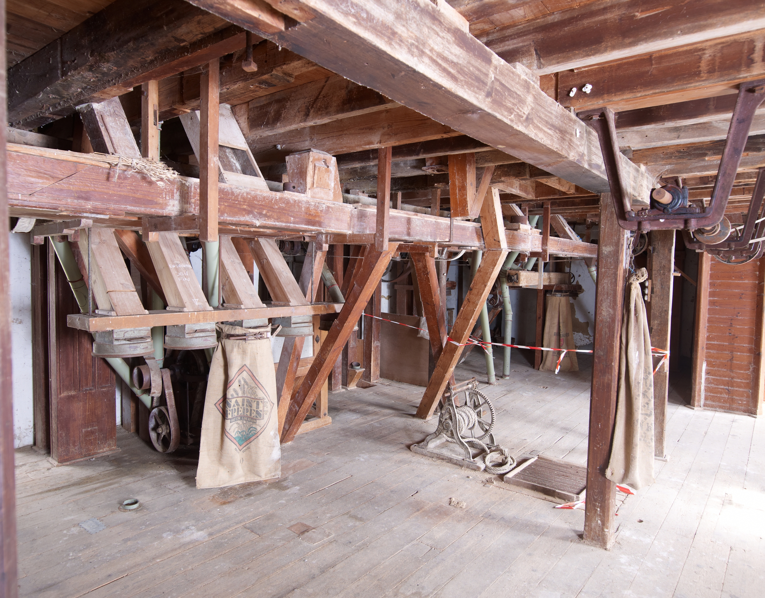 Corps central du moulin. Premier étage. Ensachage et treuil à sac devant la trappe à sacsImmatriculation
