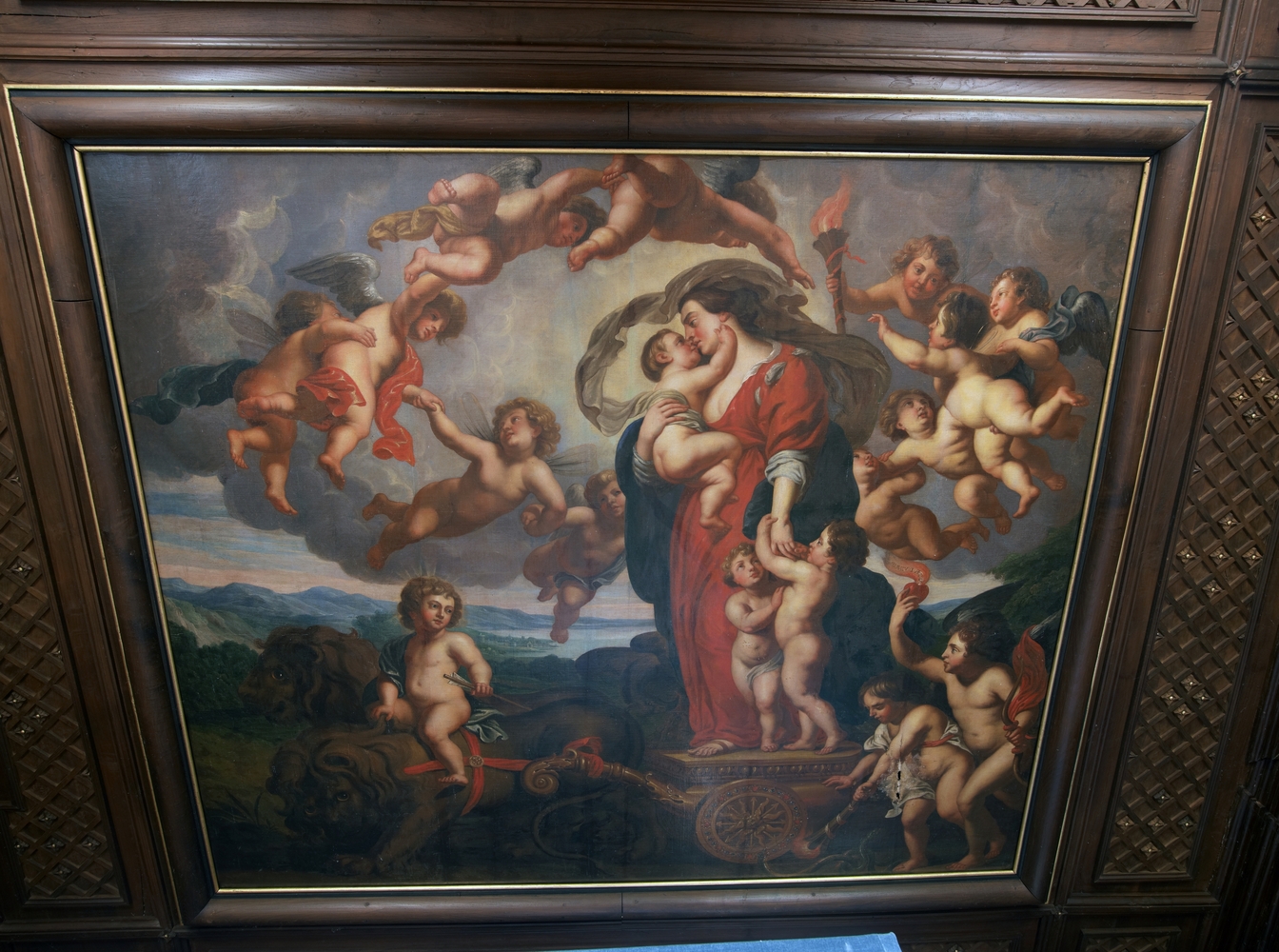 Ploubezre : château de Kergrist, vue intérieure, partie est, étage, chambre et sa collection d'objets anciens. Toile au plafond de l'école de Pierre-Paul Rubens : "Le triomphe de l'Amour maternel"Immatriculation
