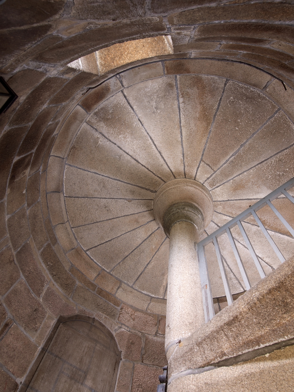 Ploubezre : château de Kergrist, vue intérieure, escalier en vis, plafond en dalle rayonnante supporté par un pilier en graniteImmatriculation