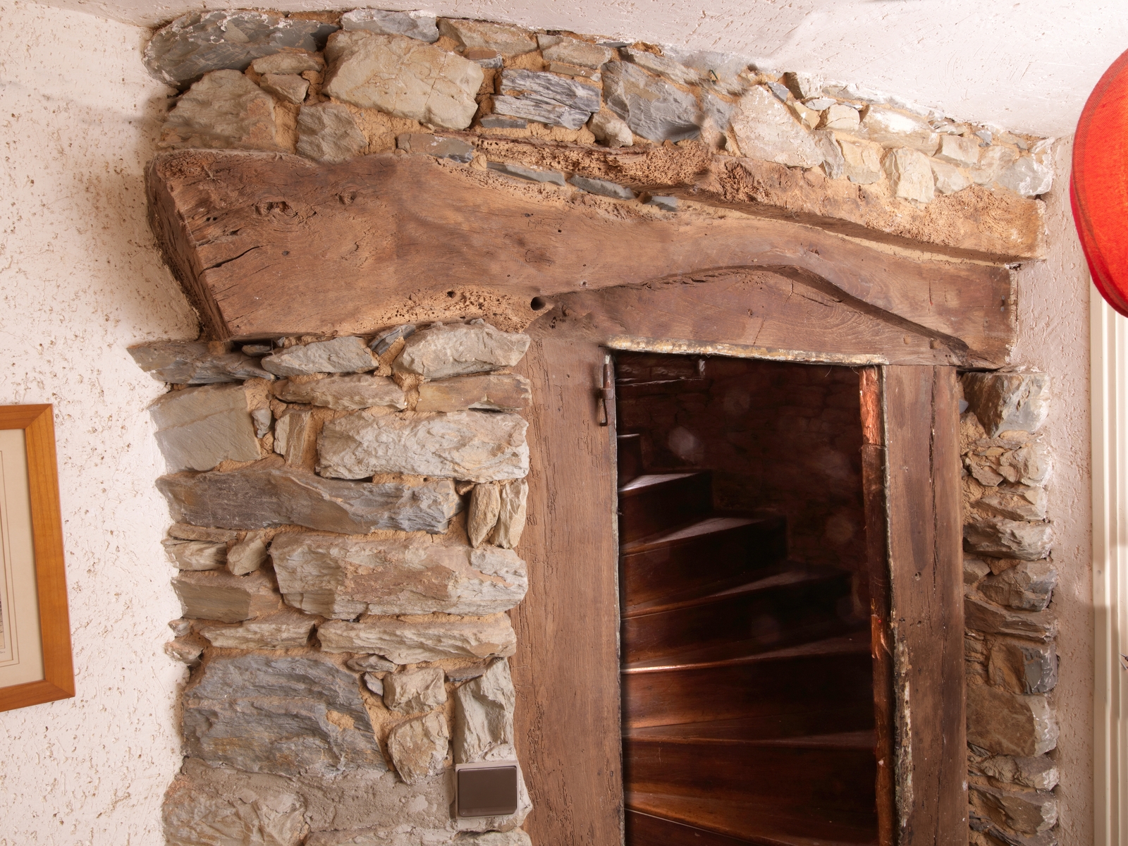 Intérieur de la tour d'escalier. Palier et porte d'accès du second étageImmatriculation