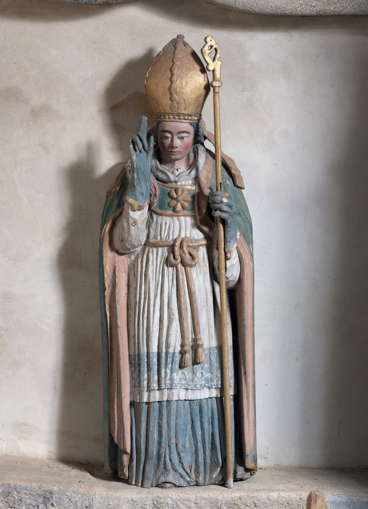 Trémel, le bourg : église paroissiale Notre-Dame, vue intérieure, transept sud formant chapelle, statue de saint Corentin (selon la légende, c'est le premier évêque de Quimper au 6e siècle)Immatriculation
