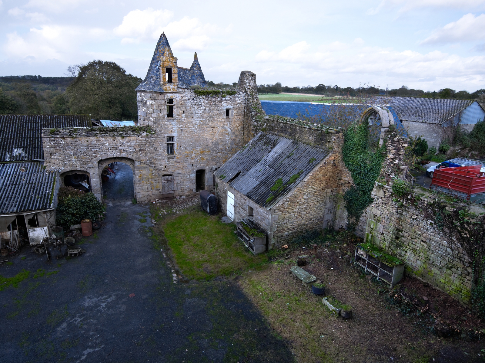 Trémel : manoir de Kermerzit, revers des portes piétonne et cochère et tour autrefois desservie par une galerieImmatriculation