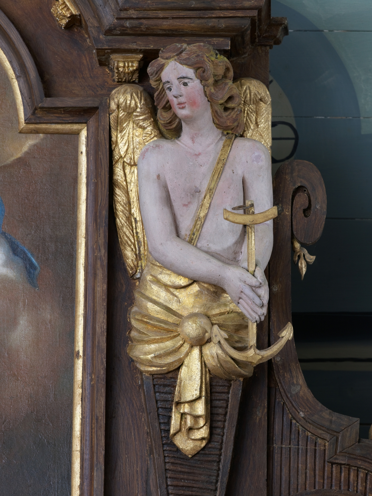 Plufur, le bourg : église paroissiale Saint-Florent, transept nord, détail du retable du 17e siècle, angeImmatriculation