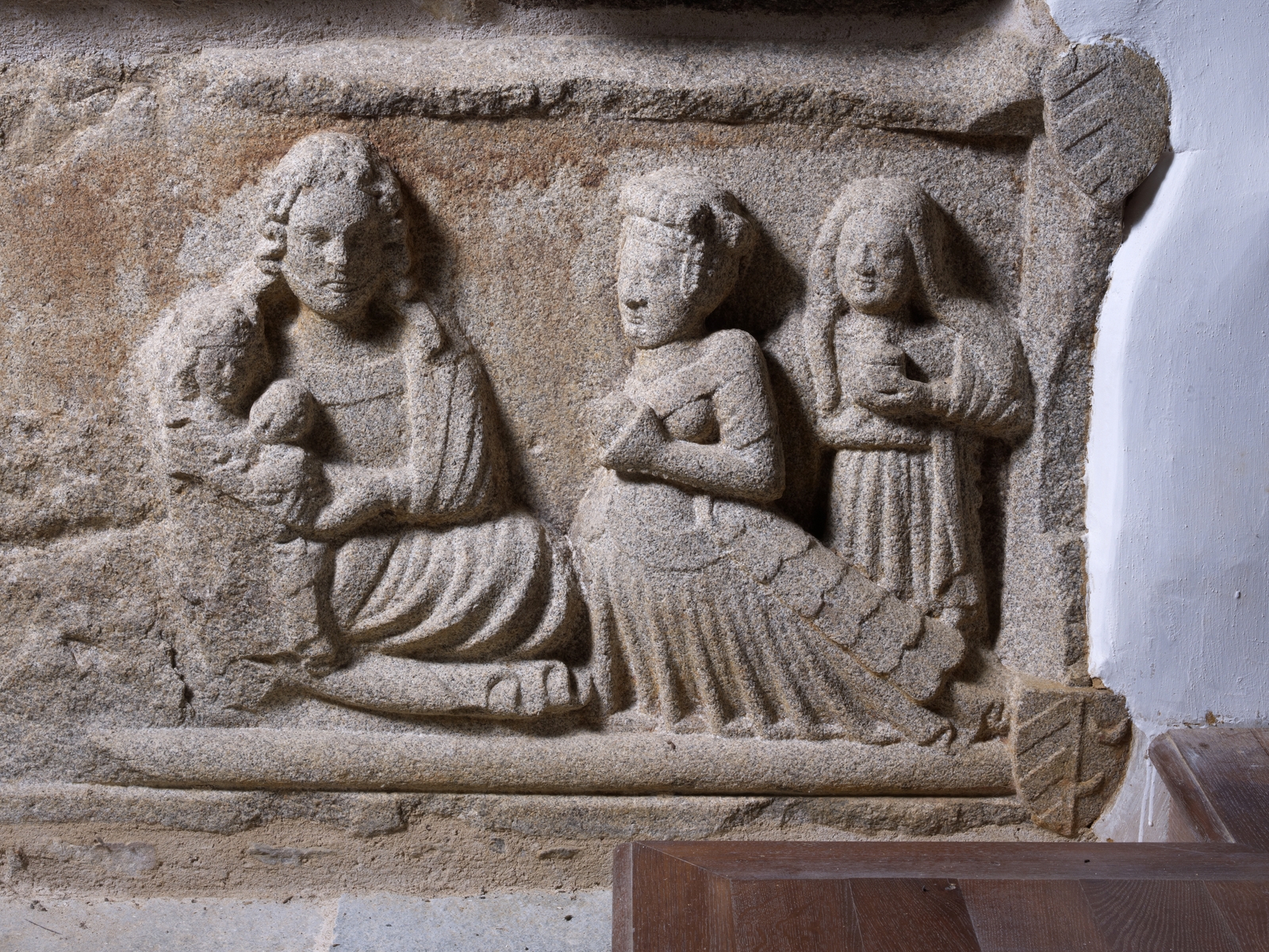 Plufur, le bourg : église paroissiale Saint-Florent, retable en granite - à l'origine situé en arrière de la table d'autel. Ici, la Nativité : la Sainte Vierge avec l'enfantImmatriculation