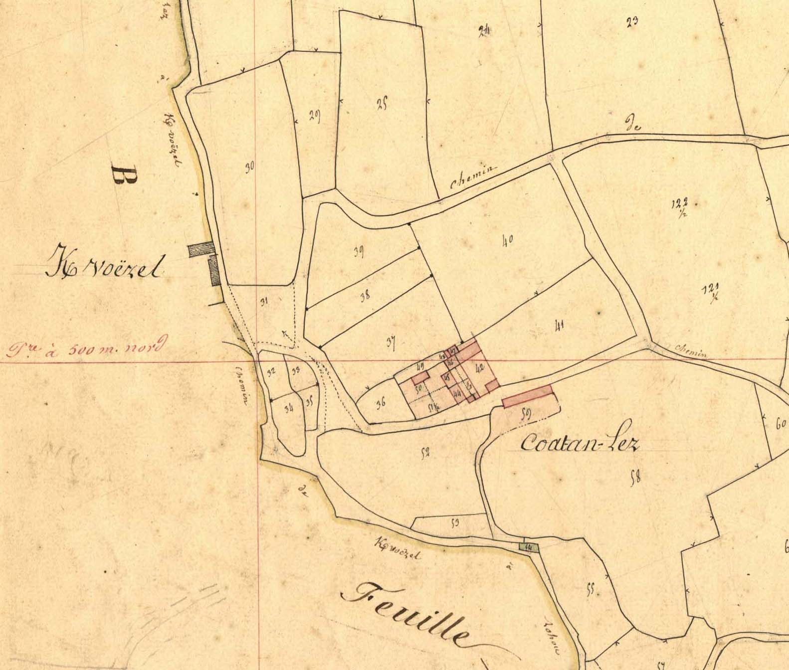 Extrait du cadastre ancien de la commune de Mantallot, 1835 : Kervoëzel et Coat an Lez [Coat an Lay]Immatriculation