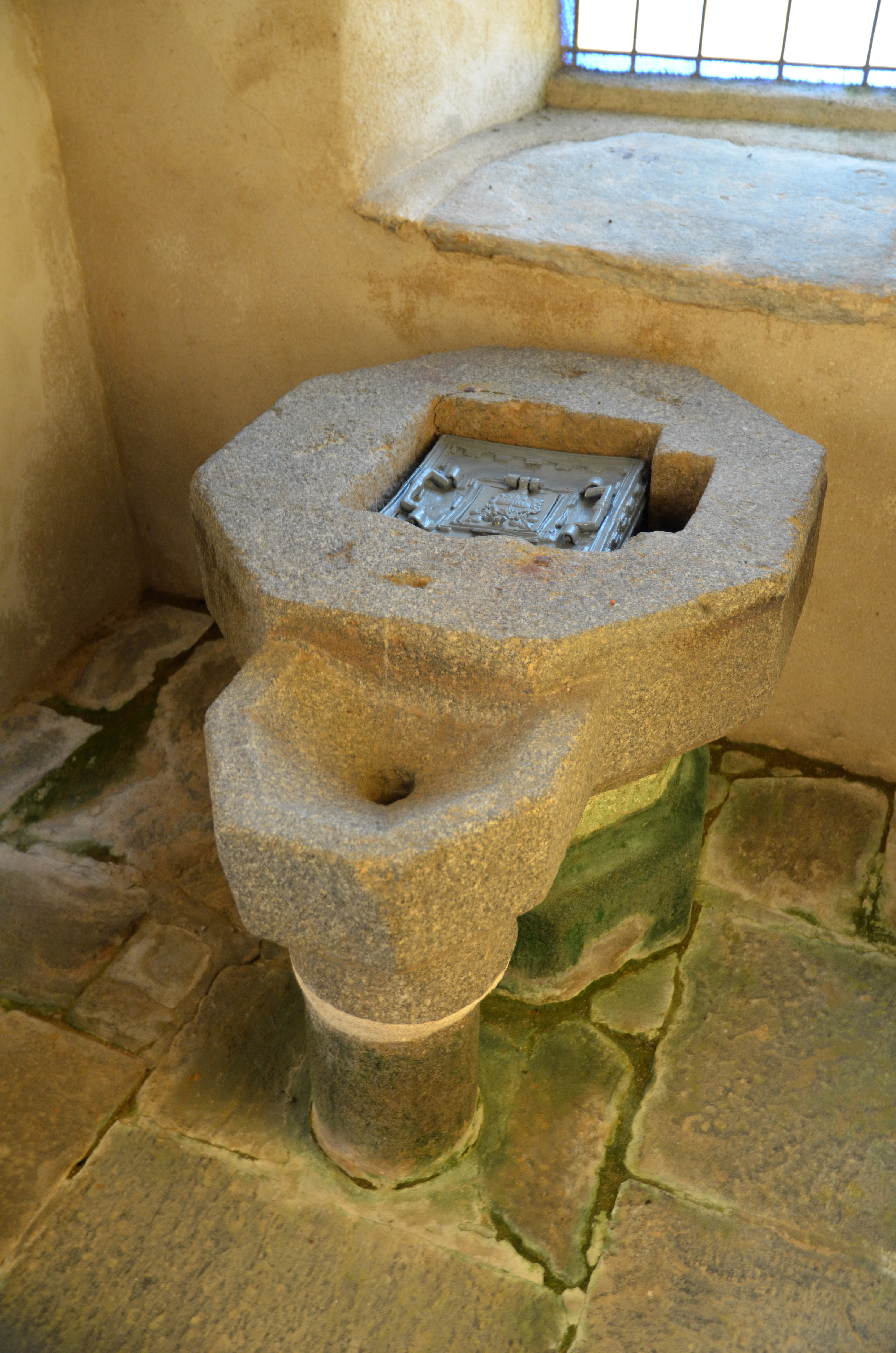 Mantallot, le bourg : église paroissiale Saint Médéric, vue intérieure, fonts baptismauxImmatriculation