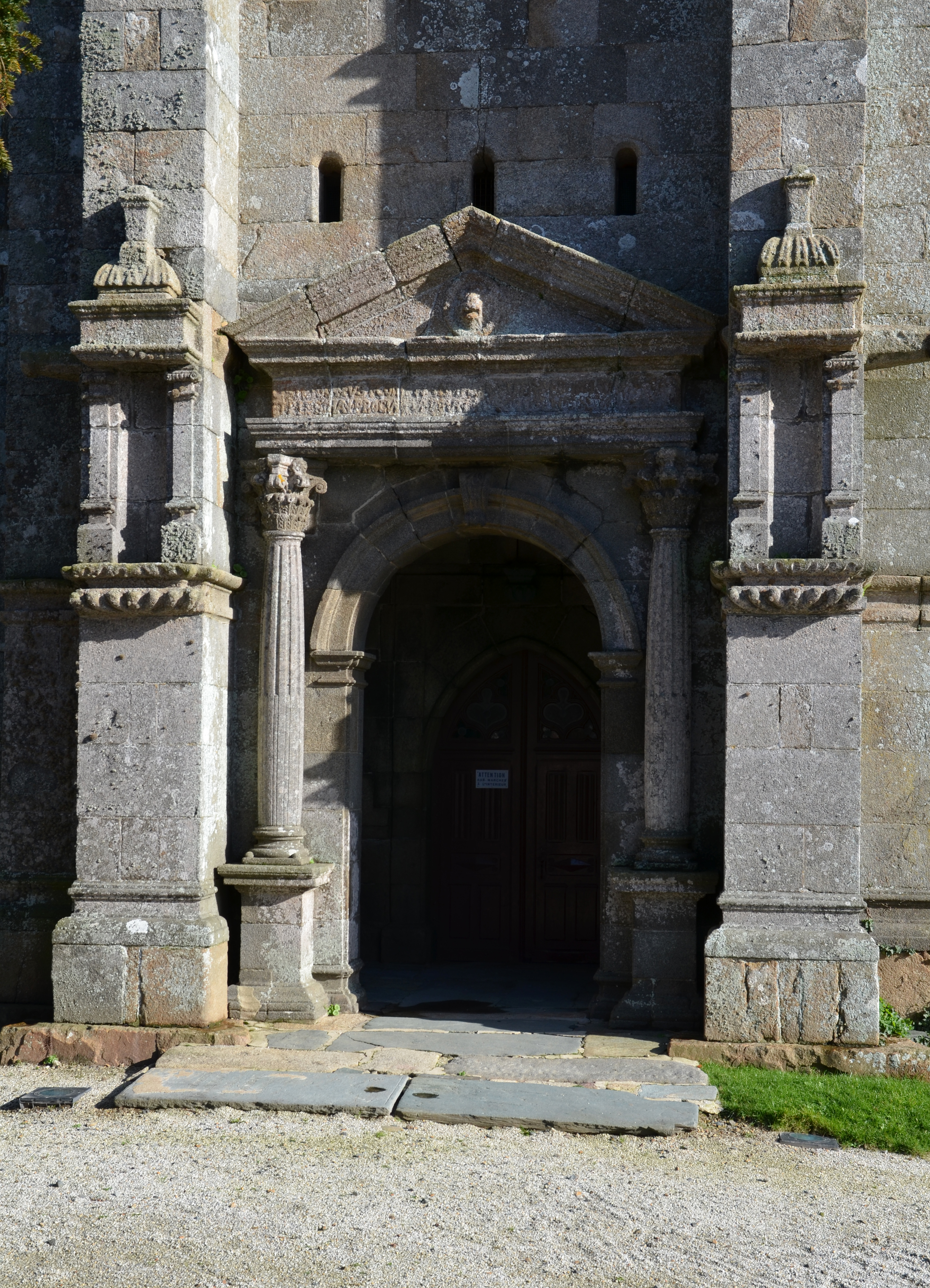 Ploubezre, le bourg : église paroissiale Saint-Pierre, vue générale de la porte ouest. Elle porte l'inscription suivante : "CESTE TOUR FUT COME[NCEE] PAR I LE TAILLANTER M. LE 8 MAY E LE F. LE BIHAN PROCUREUR POUR LA PAROISSE LORS EN L'AN 1577"Immatriculation