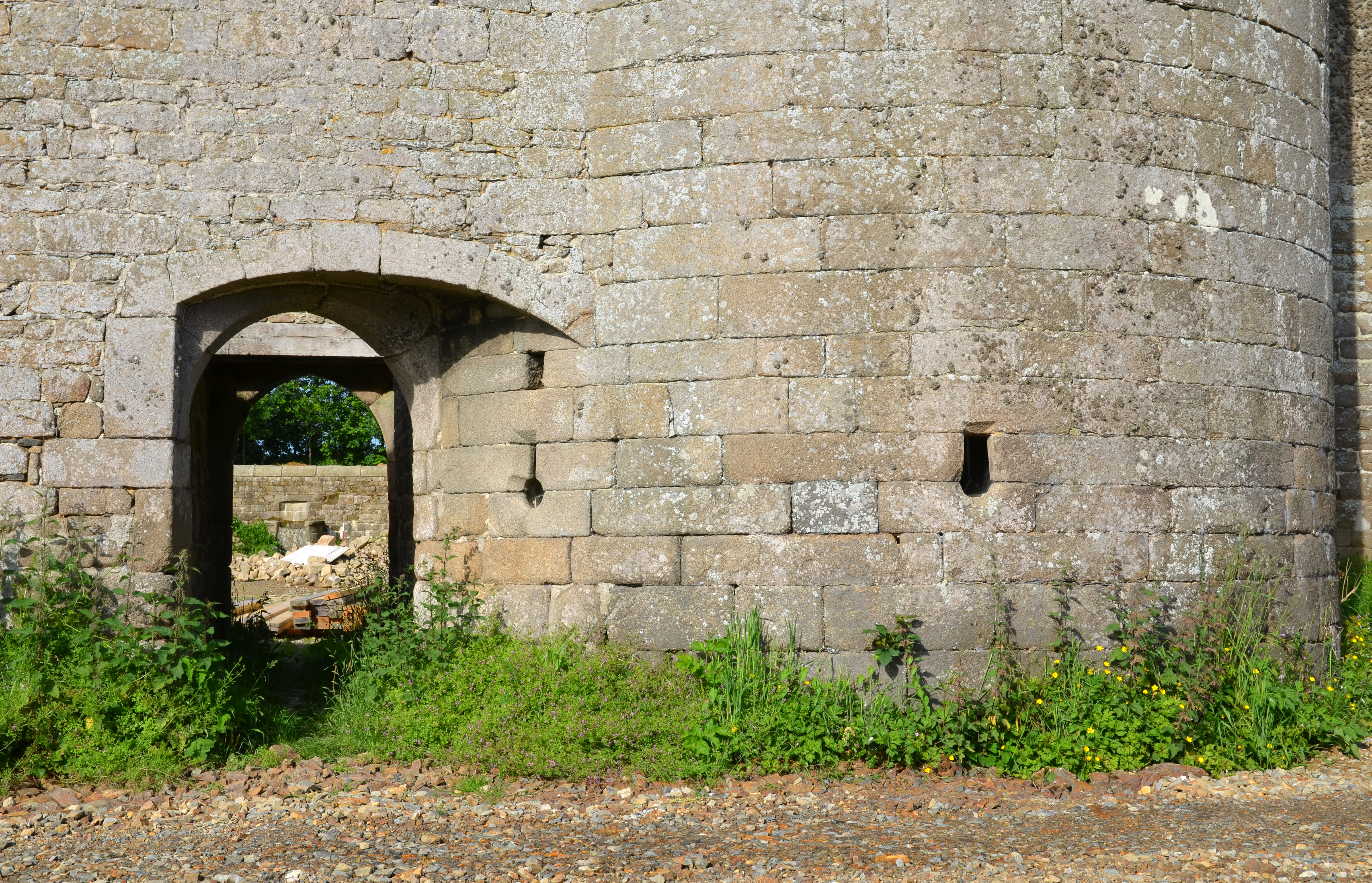 Ploubezre : manoir de Kerhervé, tour, vue de détail de la porte orientée vers le nord-est et flanquée d'ouvertures de tirImmatriculation