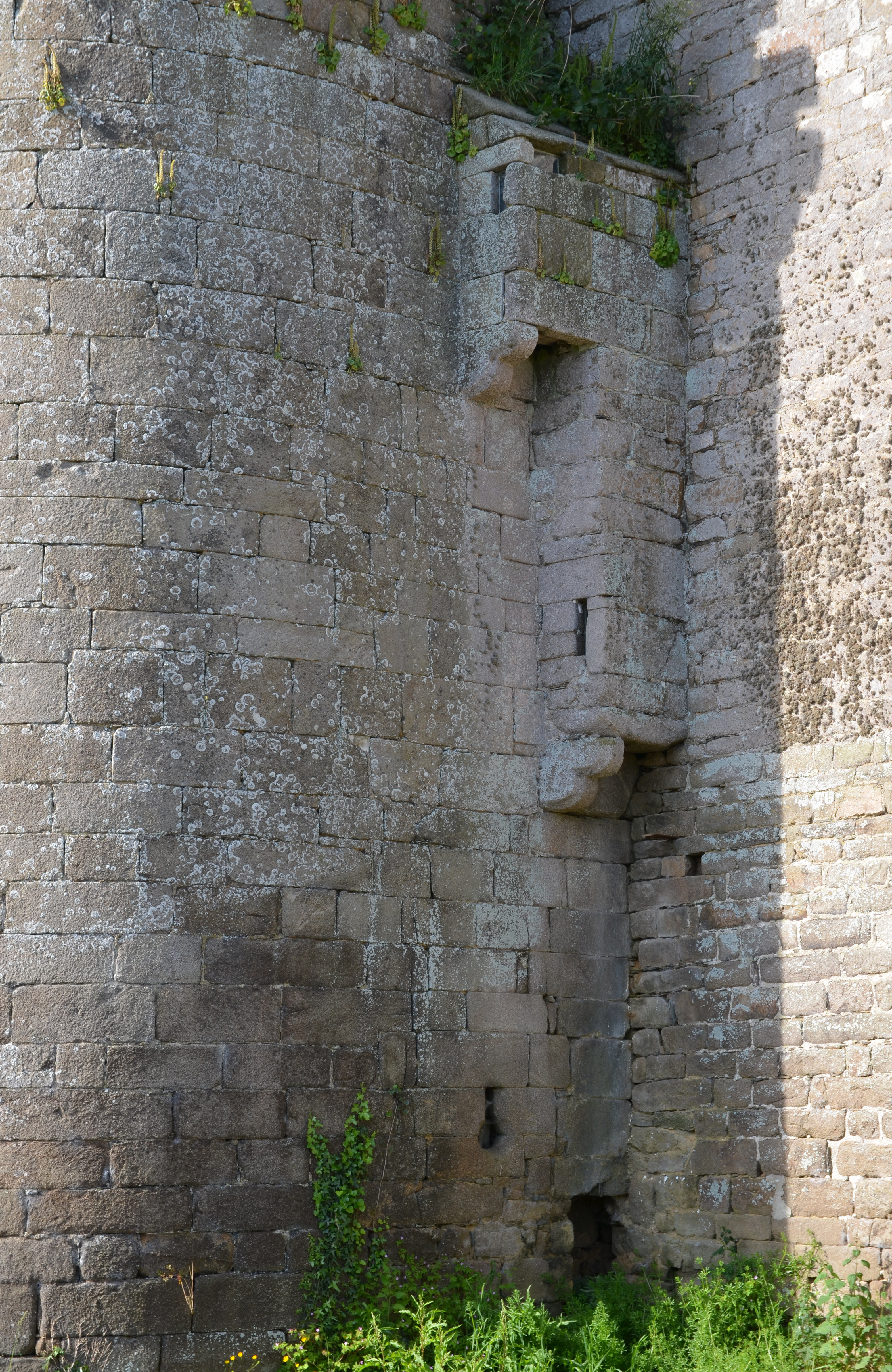 Ploubezre : manoir de Kerhervé, tour, vue de détail des trois latrines superposées en encorbellement (d'un probable fossé sec)Immatriculation