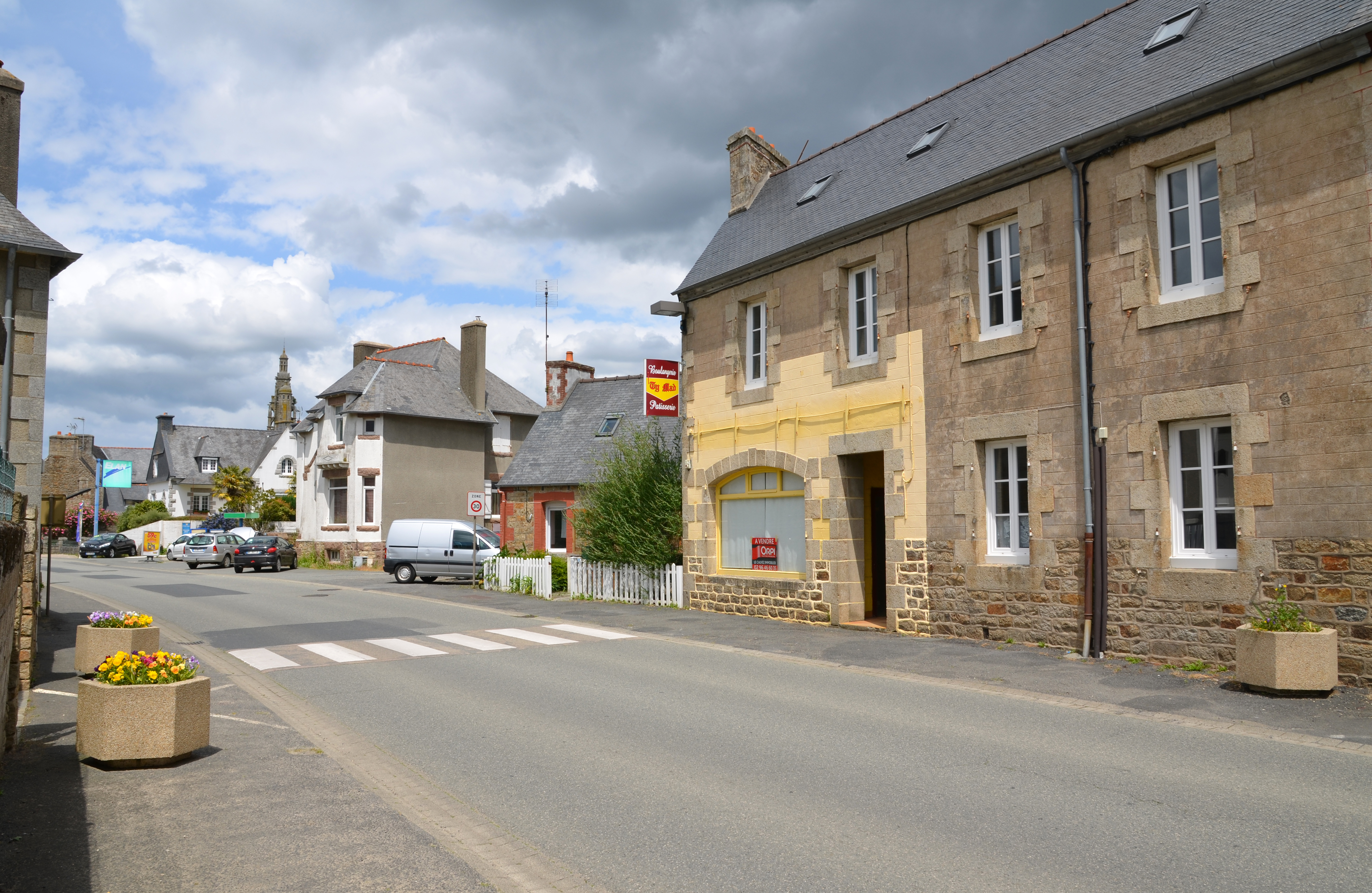 Ploubezre, rue Jean-Marie Le Foll : alignement composé d'anciens magasins de commerce et de maisonsImmatriculation
