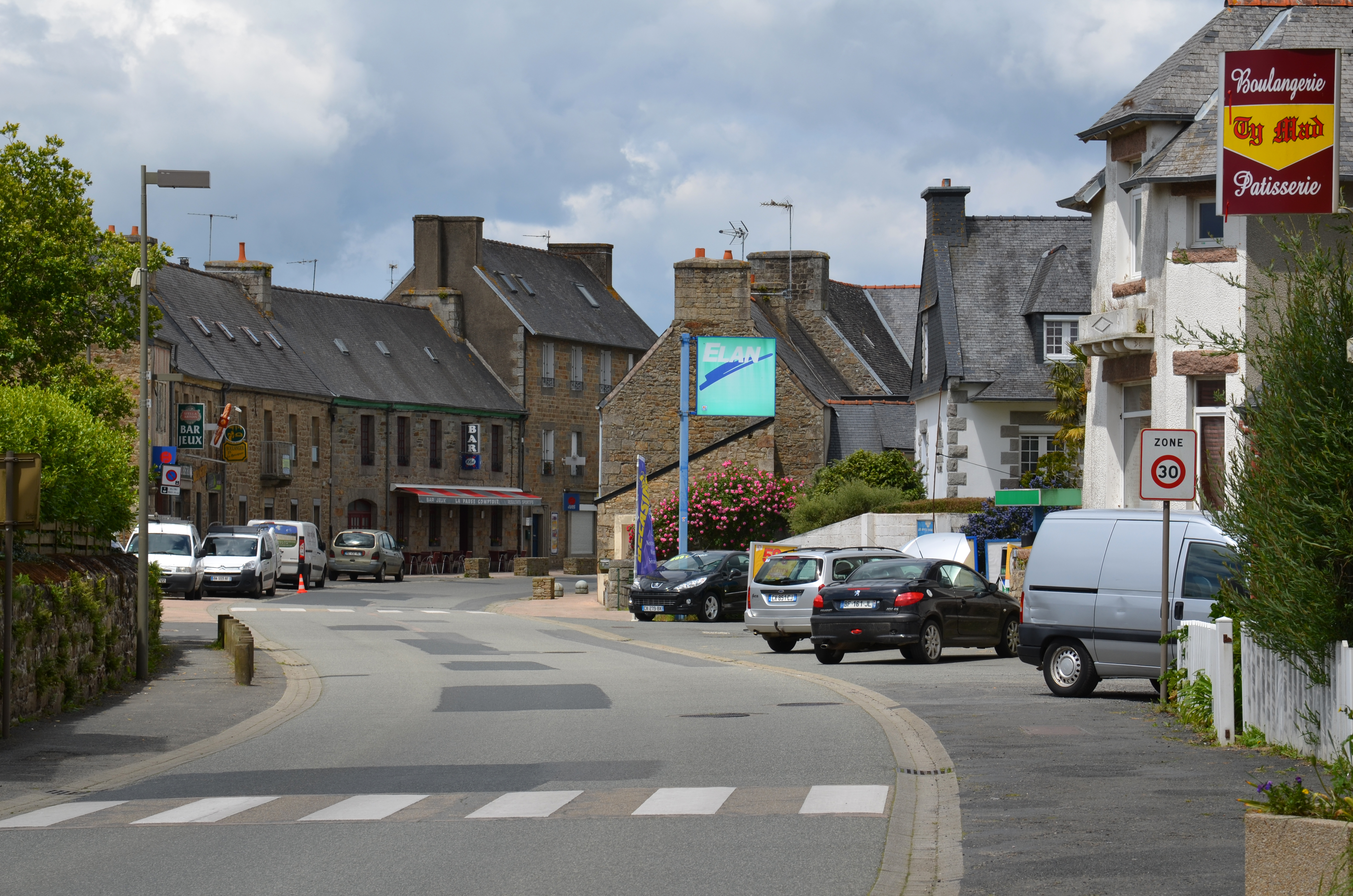 Ploubezre, rue Jean-Marie Le Foll : alignement de magasins de commerce et de maisonsImmatriculation