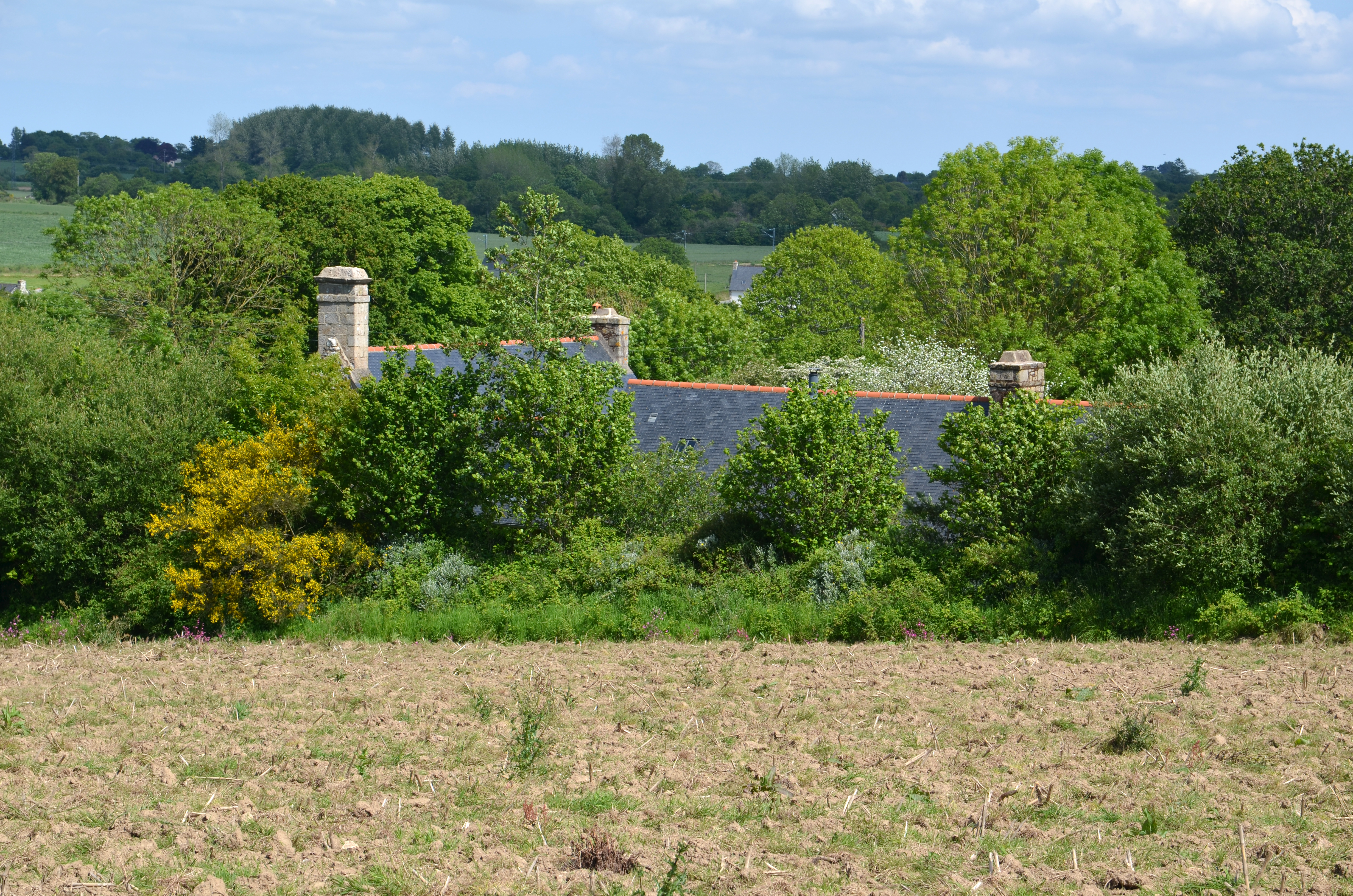 Ploubezre, Kerdaniou : vue de situation de la ferme. Seules les souches de cheminée émergent des arbres et signalent la ferme dans le paysageImmatriculation