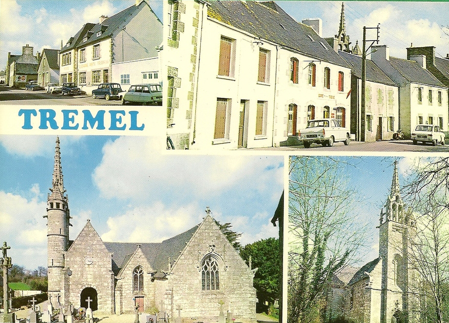 Trémel : présentation de la commune (le bourg, la poste et l'église paroissiale), carte postale (collection particulière)Immatriculation