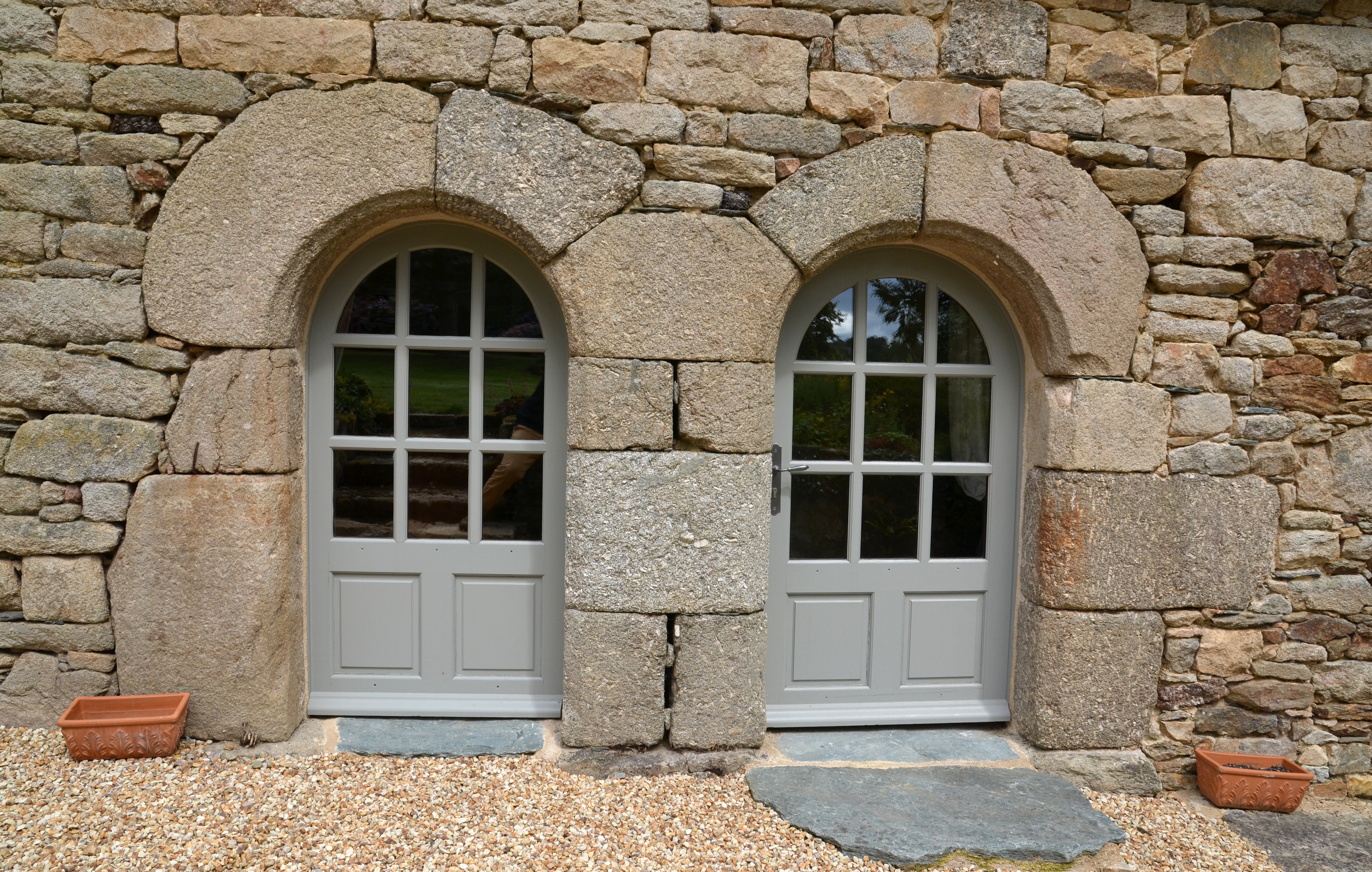 Trémel, Zan Logot : logis datable de la fin du 16e siècle ou de la première moitié du 17e siècle, élévation antérieure orientée vers le sud, détail des portes géminées à arc plein cintre chanfreinéImmatriculation