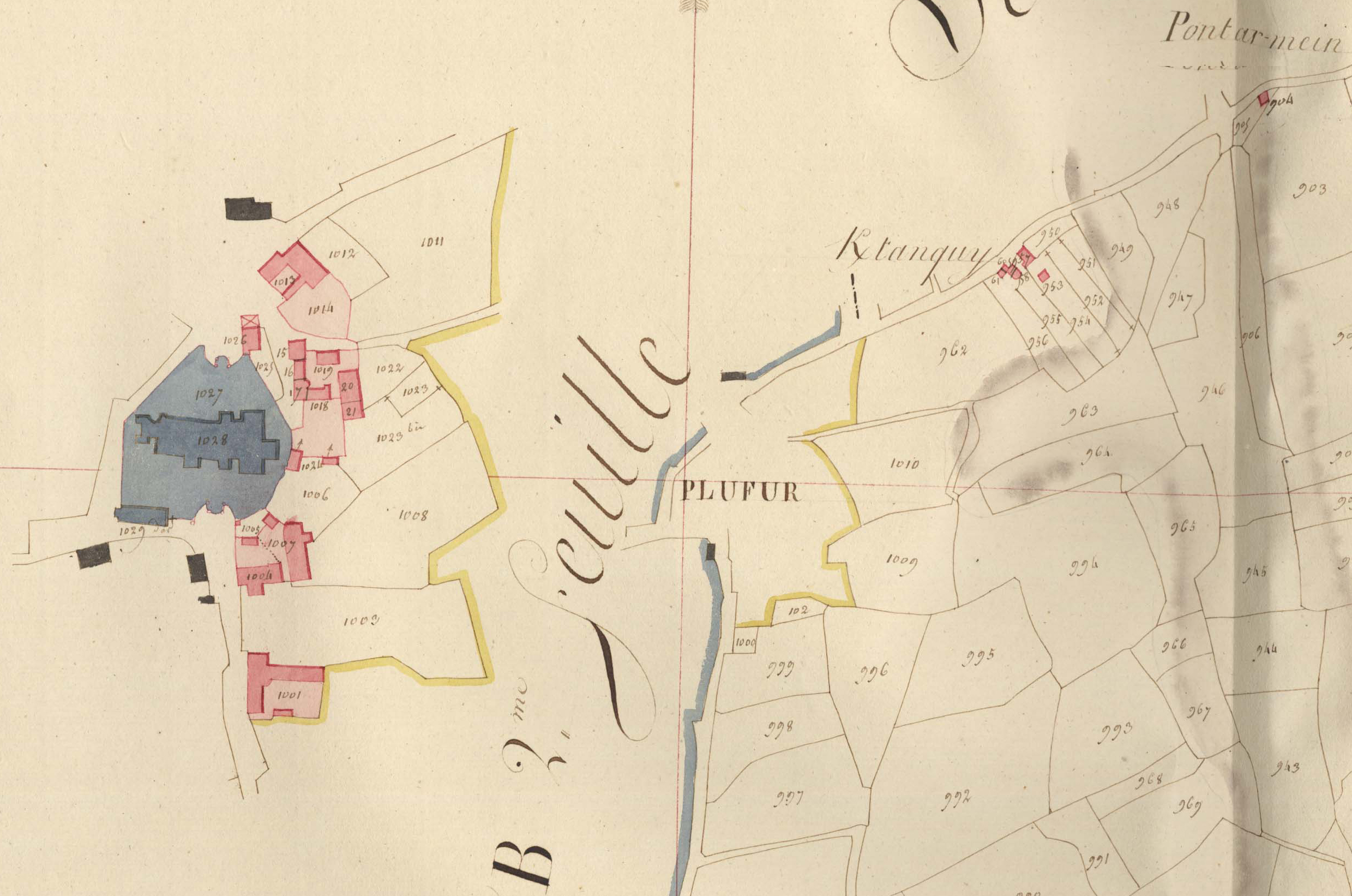 Extrait du cadastre ancien de la commune de Plufur, 1816 : le bourg (partie ouest)Immatriculation