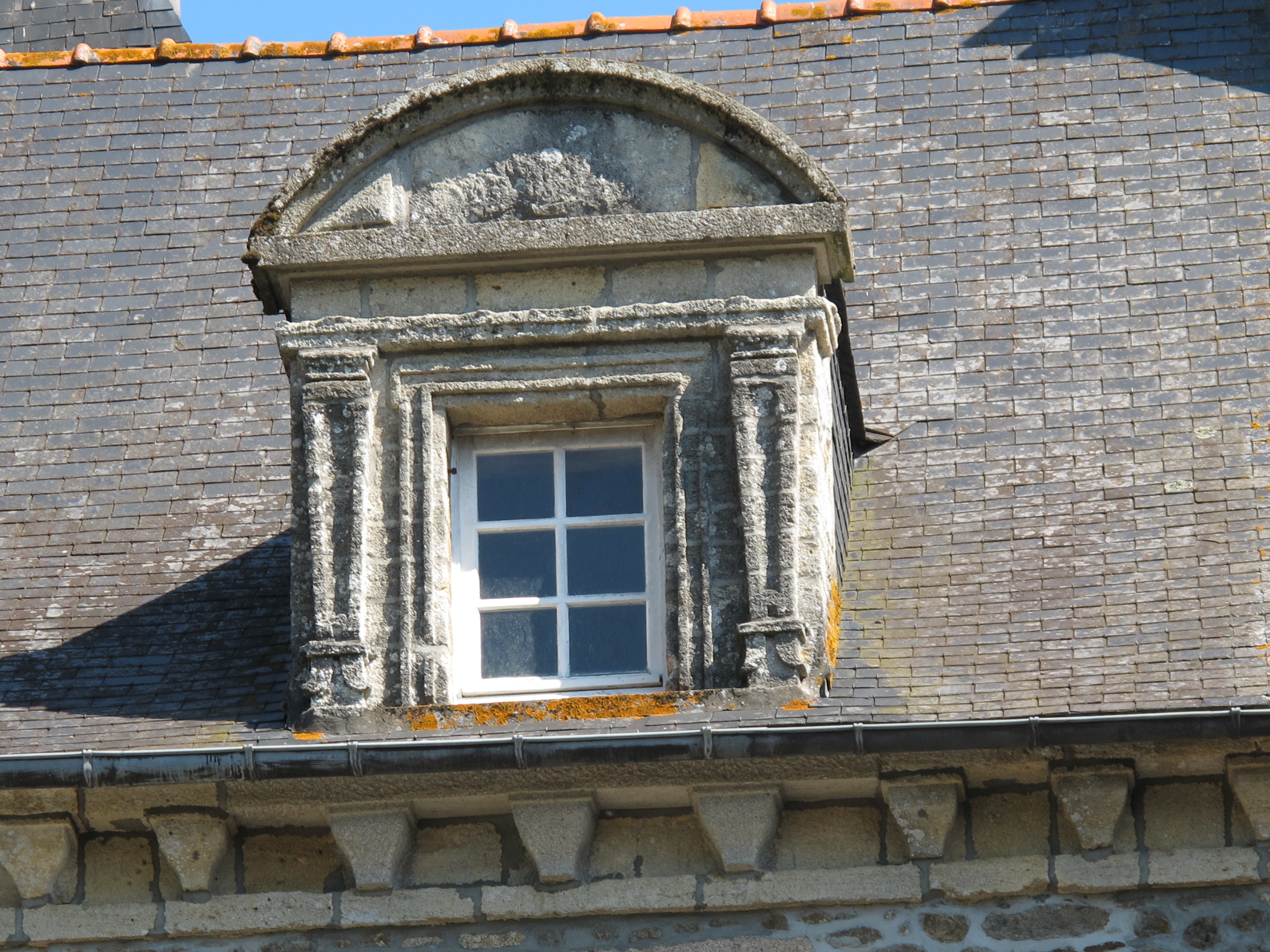 Détail: lucarne sculptée en pierre des falunsImmatriculation