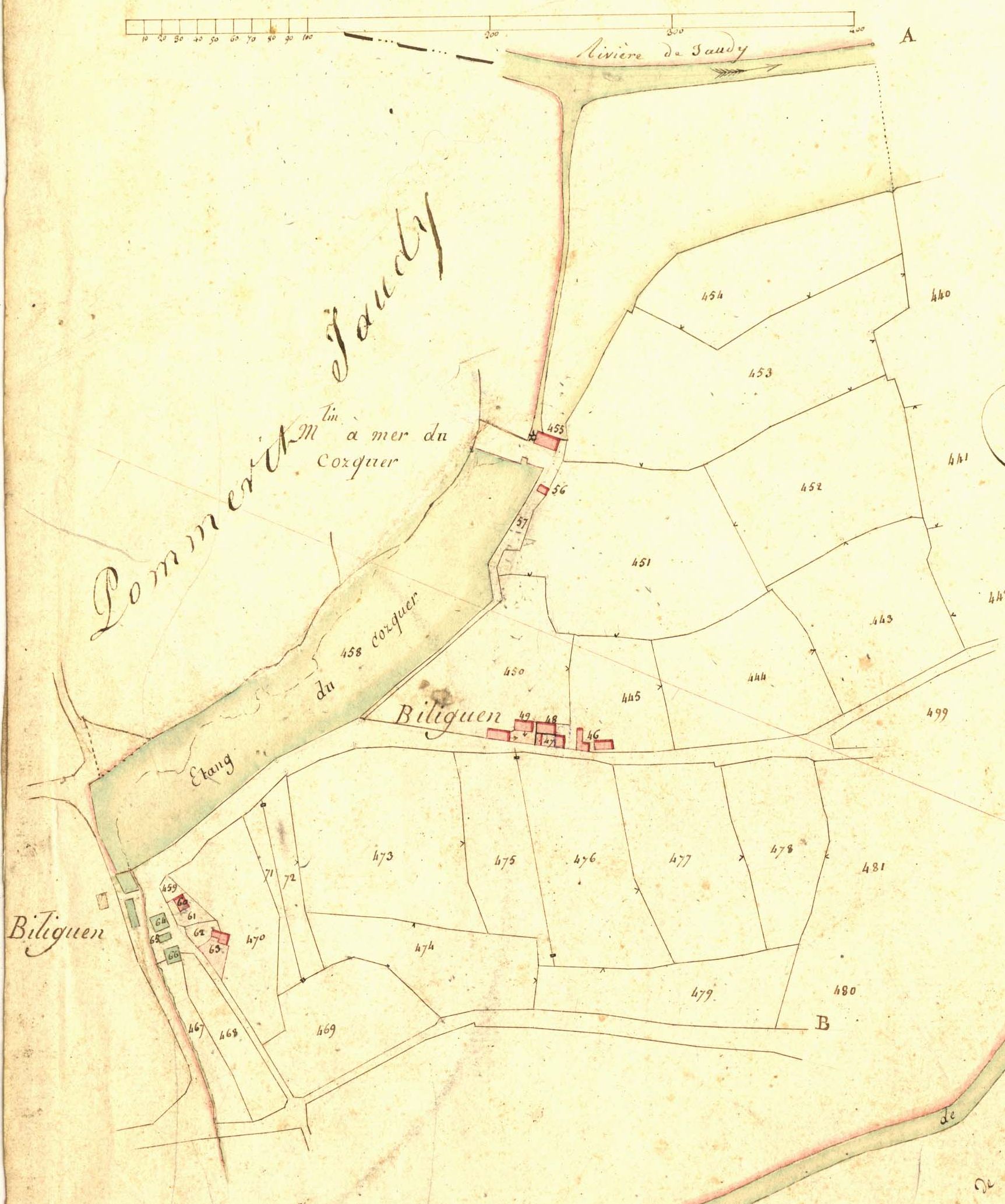Le site du moulin de Bili Gwenn en 1835. Extrait du cadastre ancien (A.D. 22, sous-série 3P, section unique, 2e feuille)Immatriculation