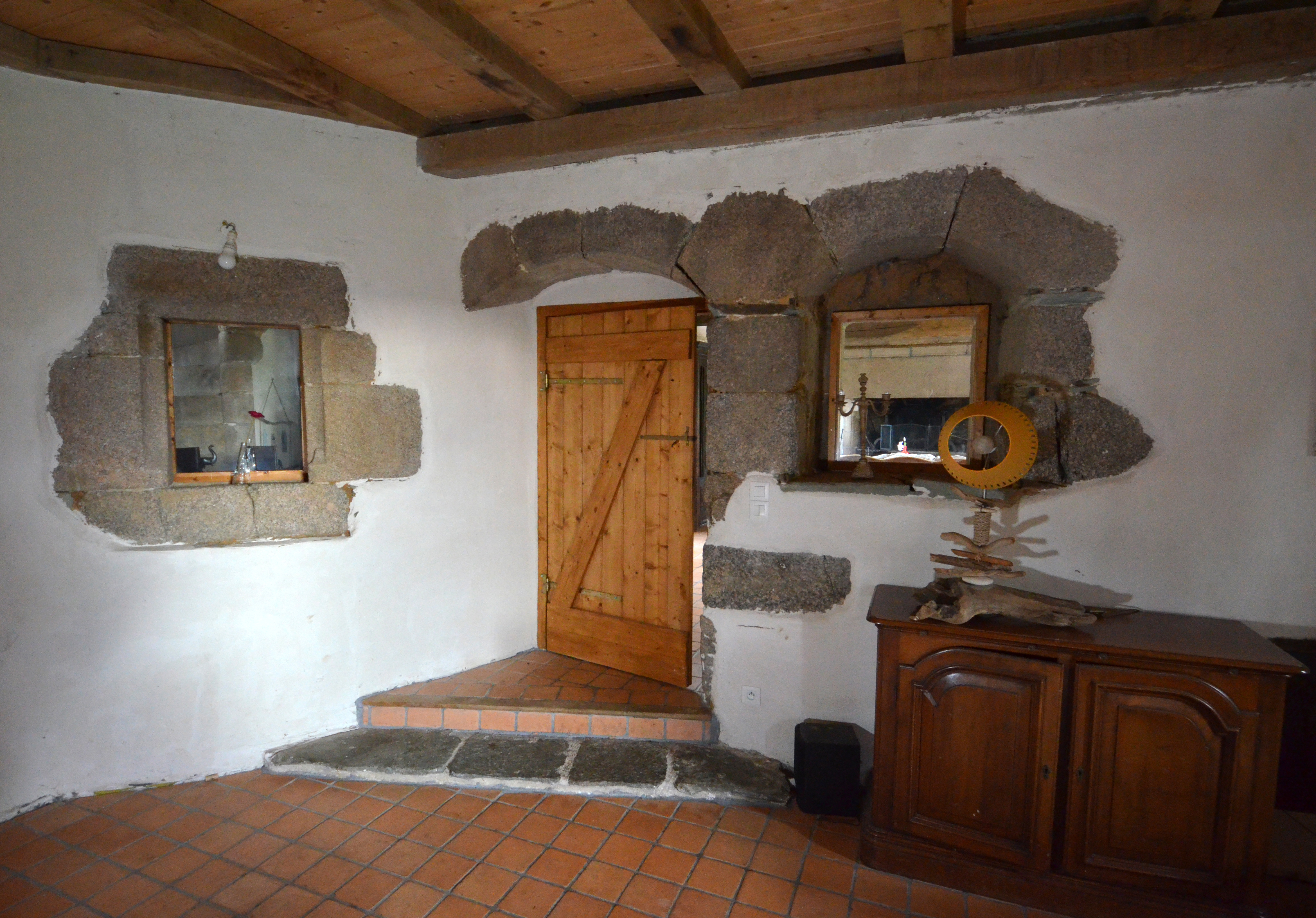 Ploubezre : manoir de Keranroux, cuisine, porte et passe-plat vers la salle basse, passe-plat de la chanre haute via l'escalier en visImmatriculation
