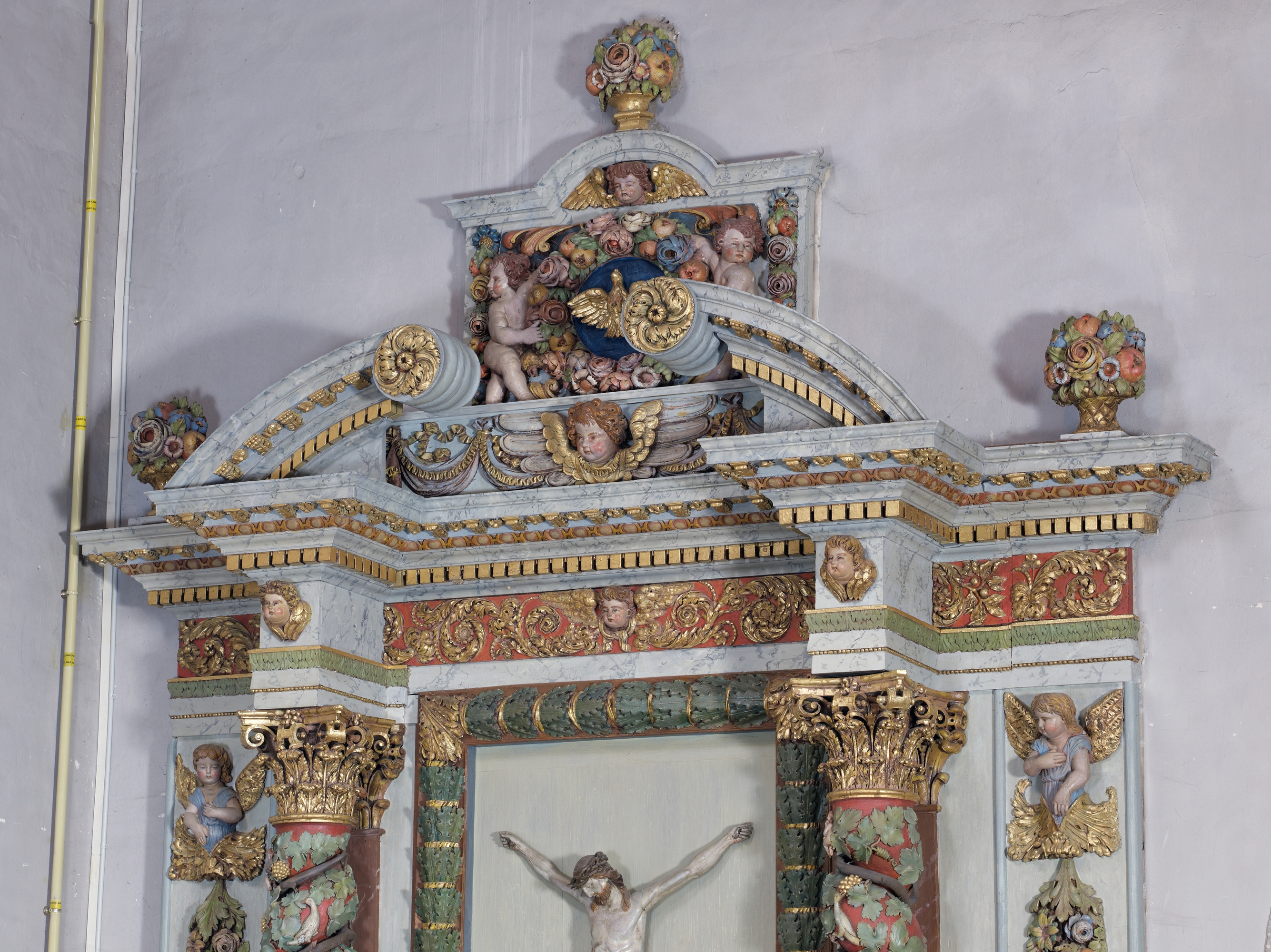 Retable latéral nord, détail du fronton, entablementImmatriculation
