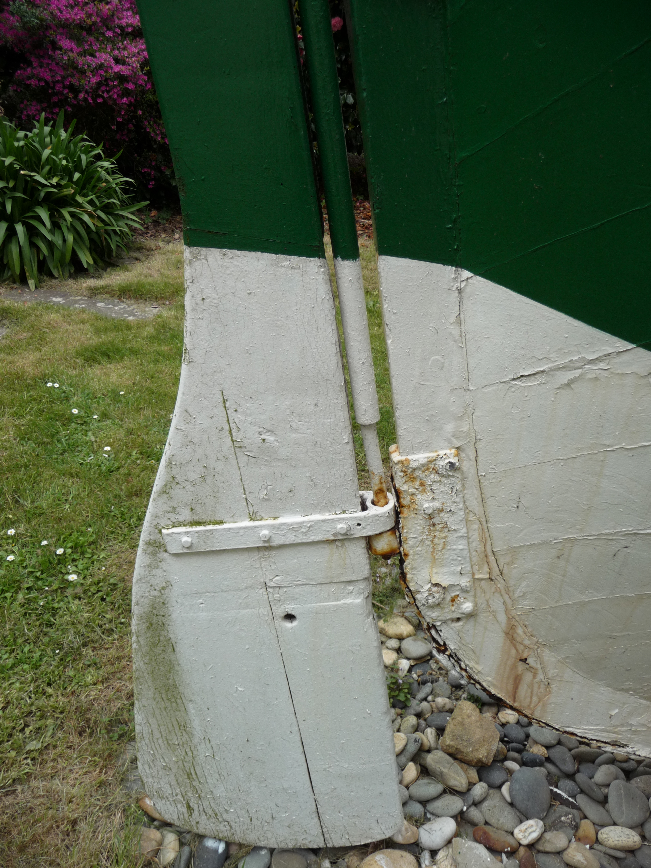 Détail tribord fixation gouvernail du Commandant Garreau, cour du Musée de la pêche de Concarneau, avril 2014Immatriculation