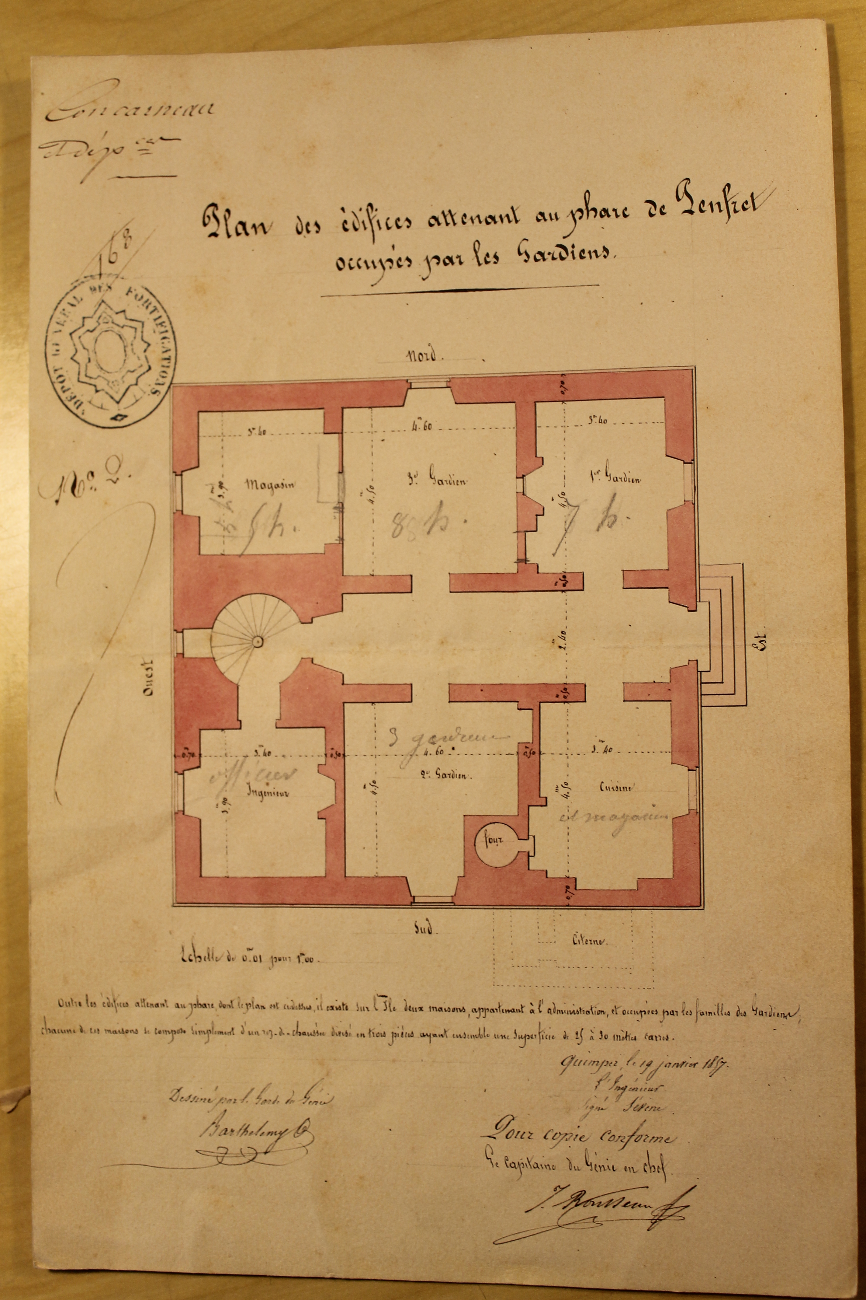 Plan des édifices attenant au phare de Penfret occupés par les gardiens, dressé par le garde du Génie, Barthélémy, Quimper le 19 janvier 1857, signé L'ingénieur Sévène, pour copie conforme, le capitaine du Génie en chef, J. RousseauImmatriculation