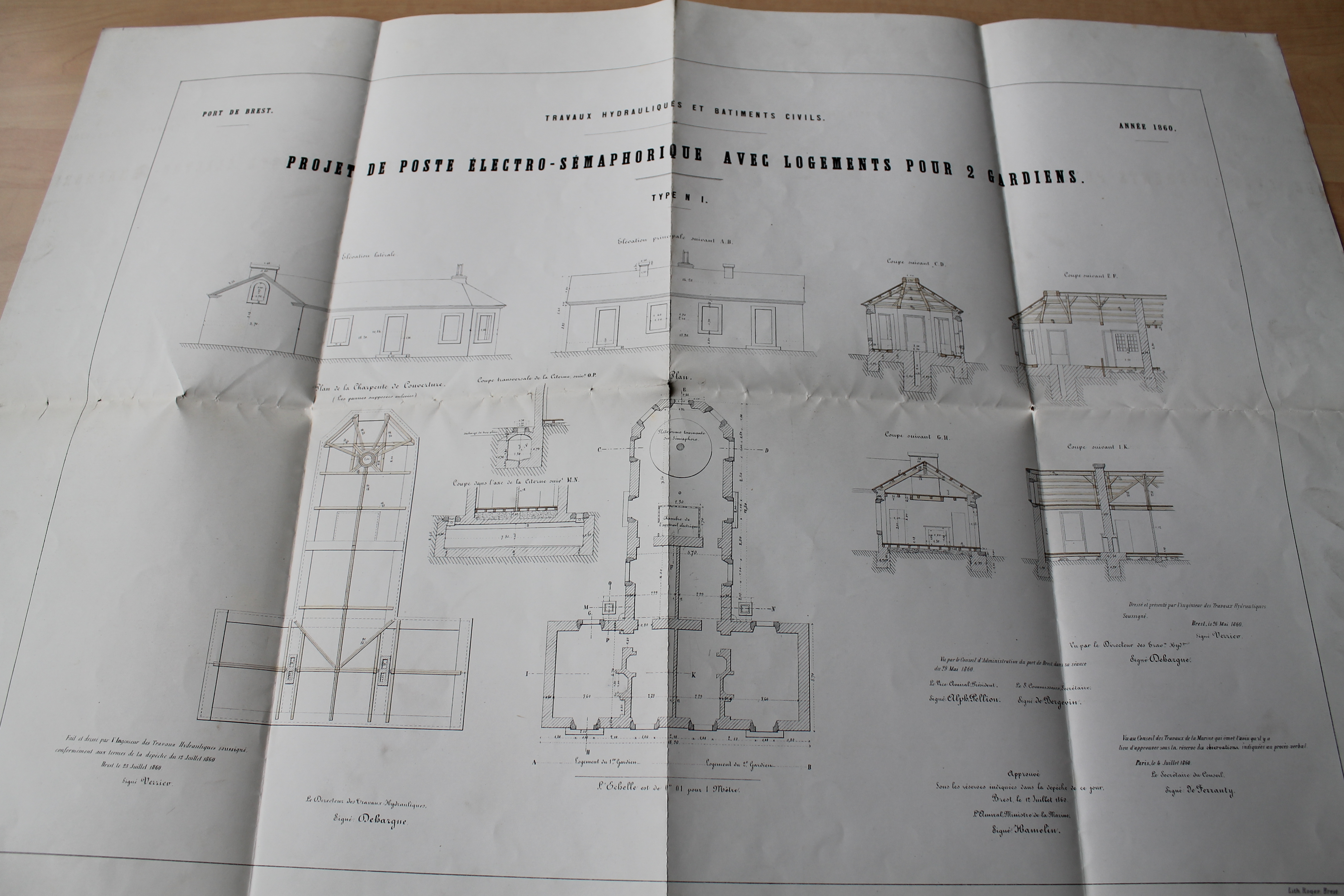 Projets de poste électro-sémaphoriques avec logement pour deux gardiens. Port de Brest, travaux hydrauliques et bâtiments civils. Signé par le directeur des travaux hydrauliques, Dehargne, Brest le 26 mai 1860Immatriculation