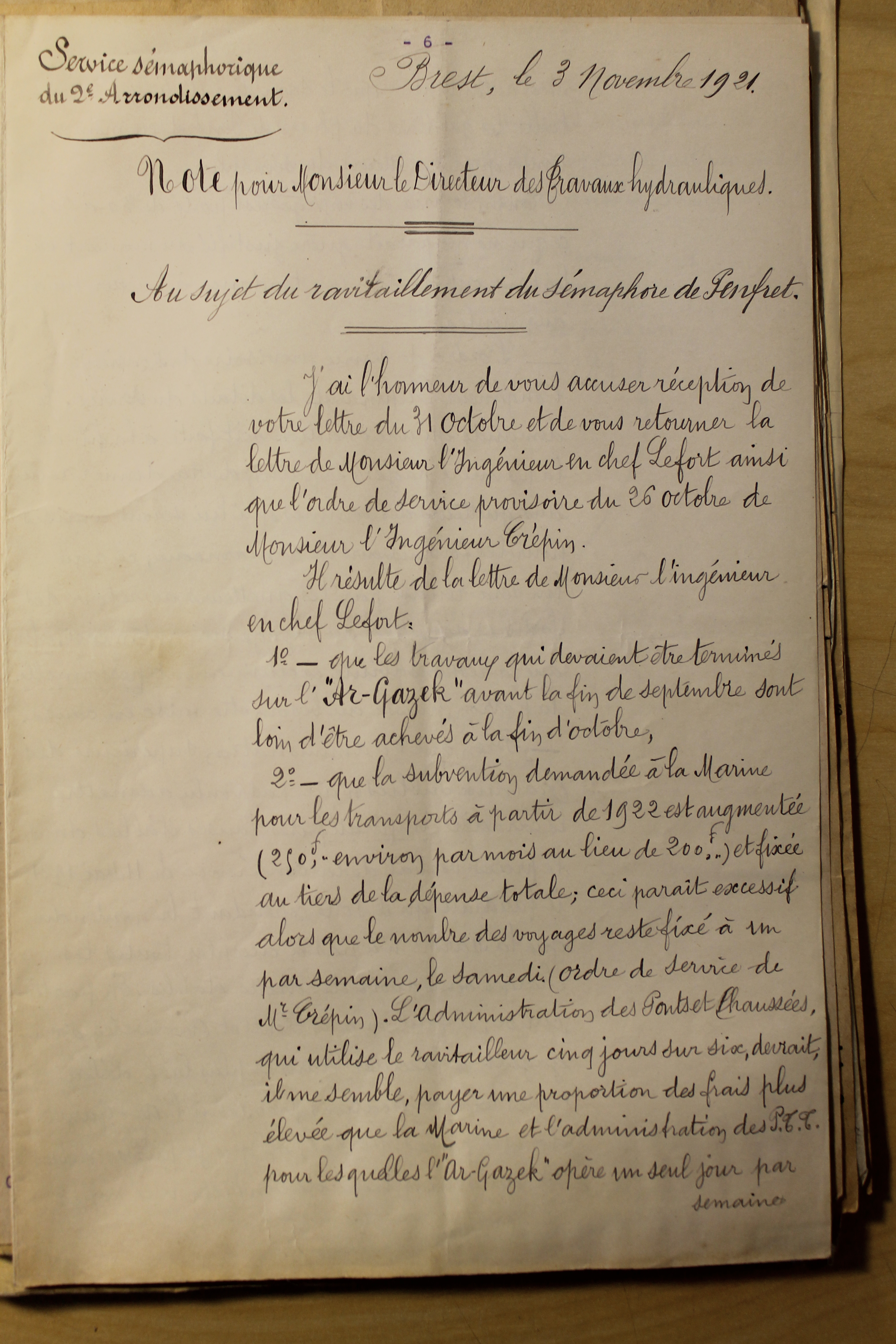 Note pour Monsieur le Directeur des Travaux Hydrauliques, au sujet du ravitaillement du Sémaphore de Penfret. Brest, le 3 novembre 1921