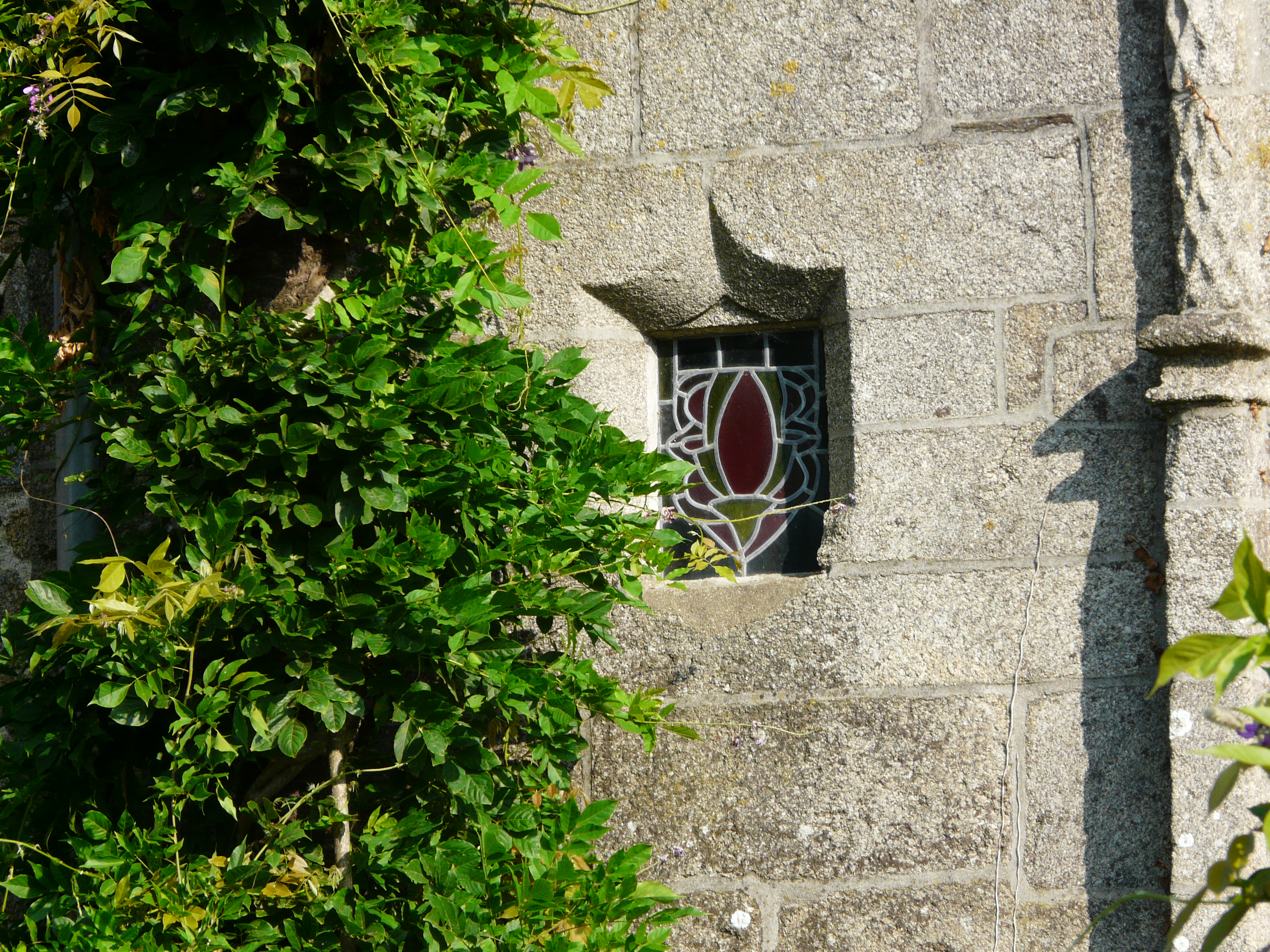 Détail du vitrail à côté de la porte d'entrée, produit Le Bihan et représentant le blason des AnsquerImmatriculation