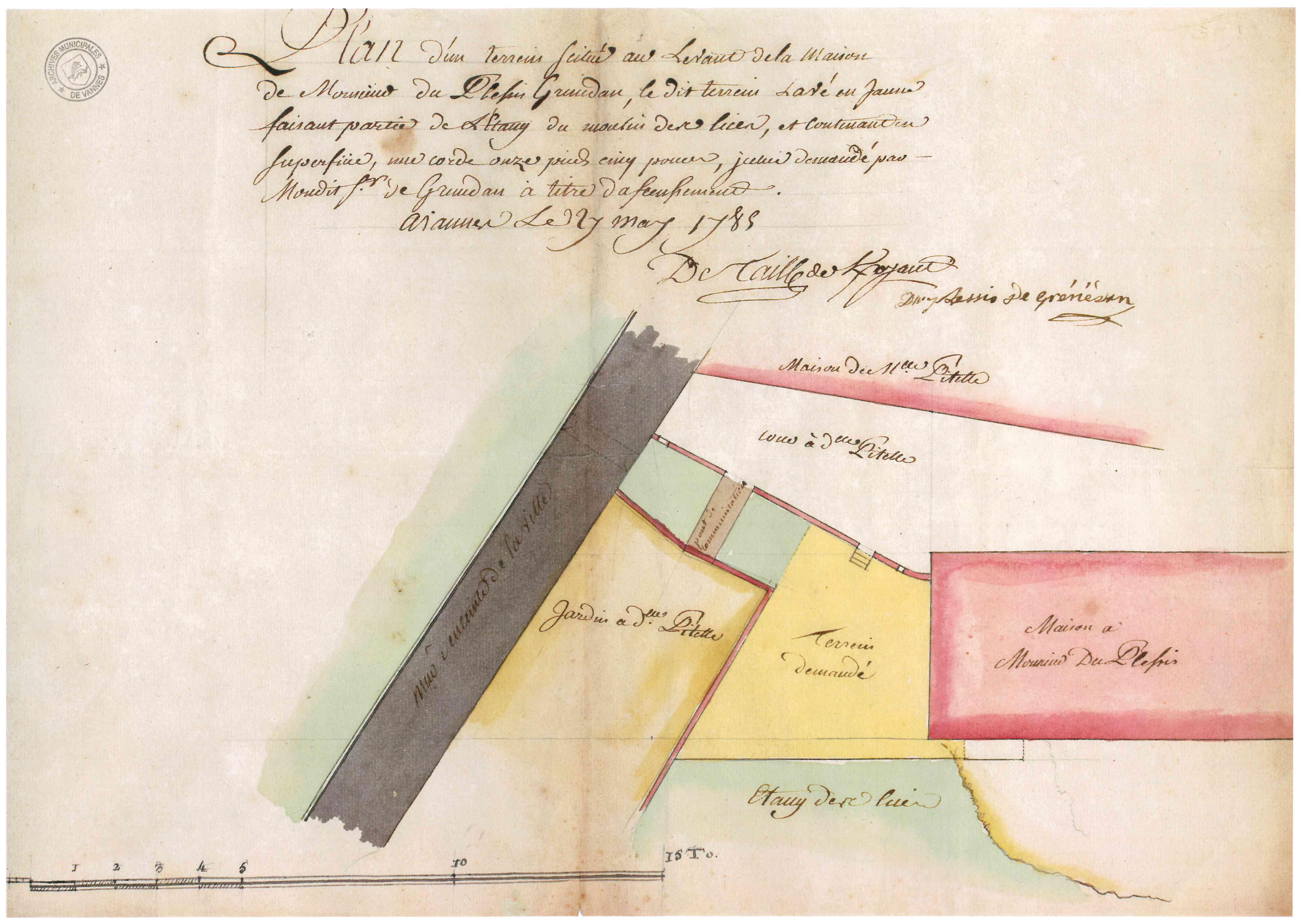 Plan d'un terrain situé à l'est de la maison de monsieur du Plessis de Grénédan, 1785 par Detaille de Keroyant. AM Vannes DD8.Immatriculation