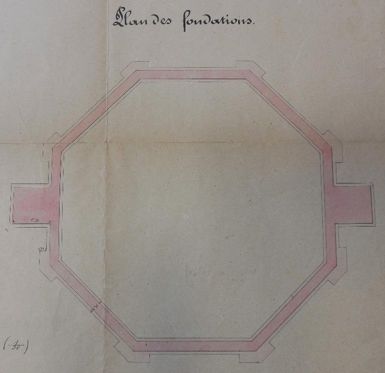Croquis d'une plate-forme pour musique militaire : plan des fondations, signé Ernest de Lamarzelle, 23 mai 1877, AM Vannes 52 FiImmatriculation