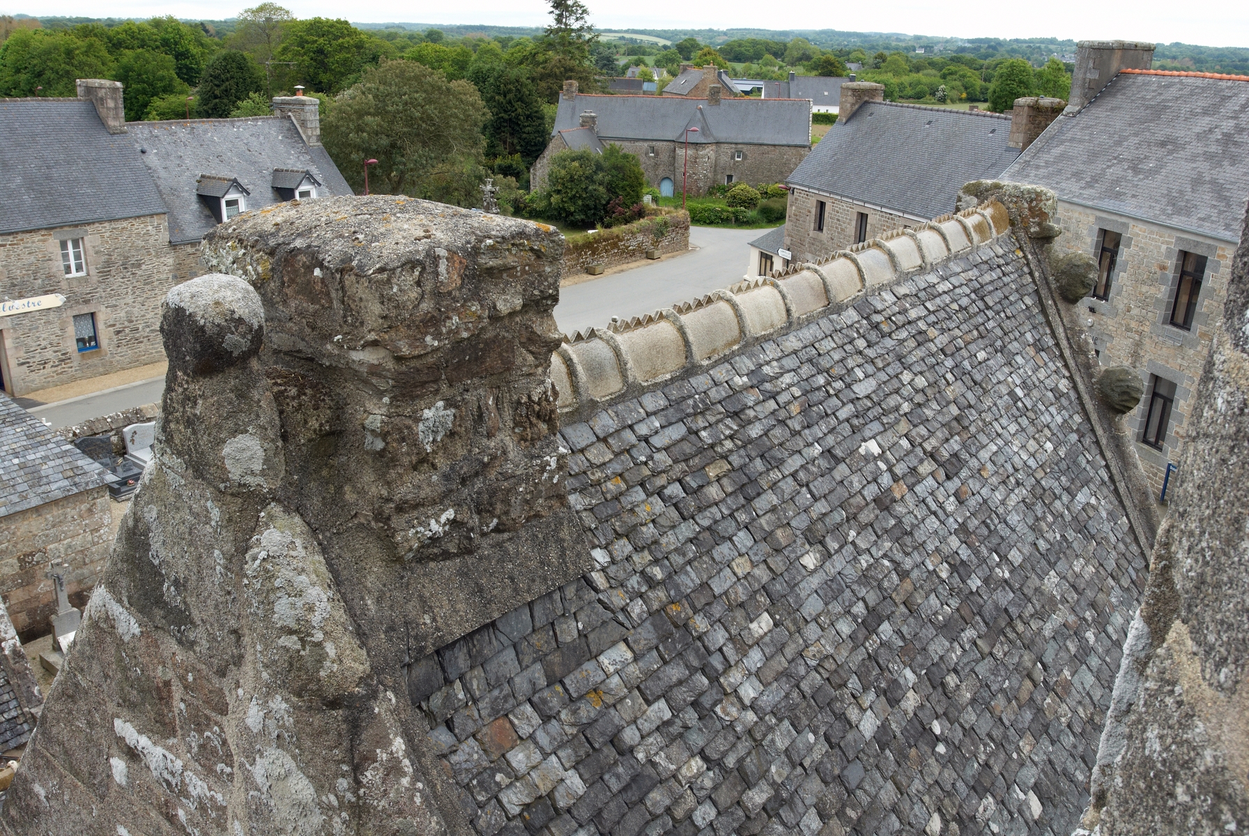 Plouzélambre, le bourg, enclos paroissial : église Saint-Sylvestre, porche monumental sud, souche de cheminée de la secrétairerie, petite pièce servant de "chambre des archives"Immatriculation