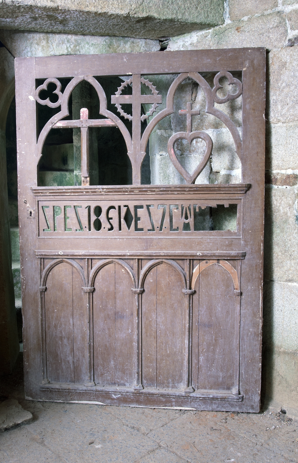 Plouzélambre, le bourg, enclos paroissial : église Saint-Sylvestre, porche monumental sud, secrétairerie située à l'étage. Du mobilier est entreposé dans cette pièce : ici, la porte de la clôture des fonts baptismaux datée 1851Immatriculation
