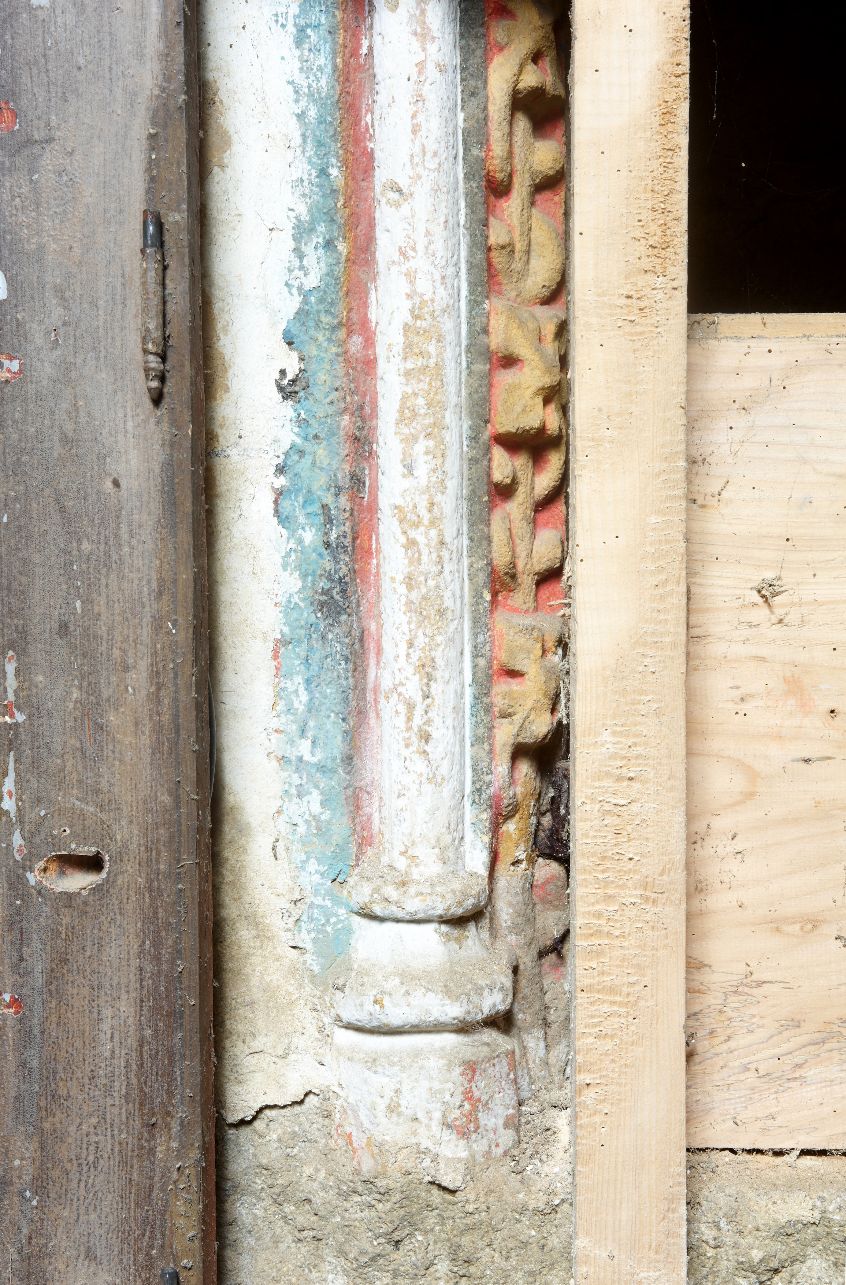 Plouzélambre, le bourg, enclos paroissial : église Saint-Sylvestre, niche aménagée dans l'épaisseur du mur du chevet (sacrarium : placard mural servant primitivement de sacristie). Des traces de polychromie sont visiblesImmatriculation