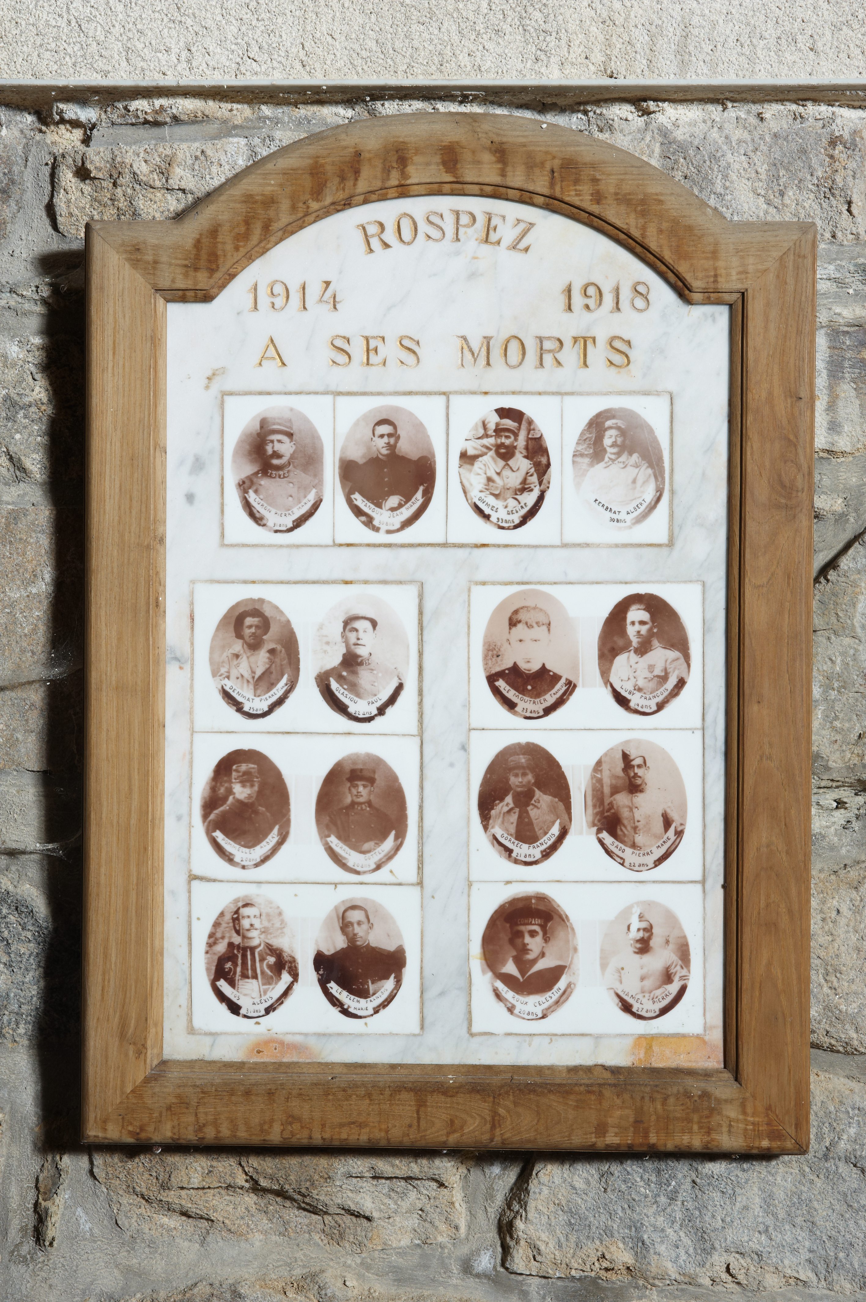 Rospez, le bourg : église paroissiale, portraits des soldats rospéziens morts pendant la Première Guerre mondialeImmatriculation