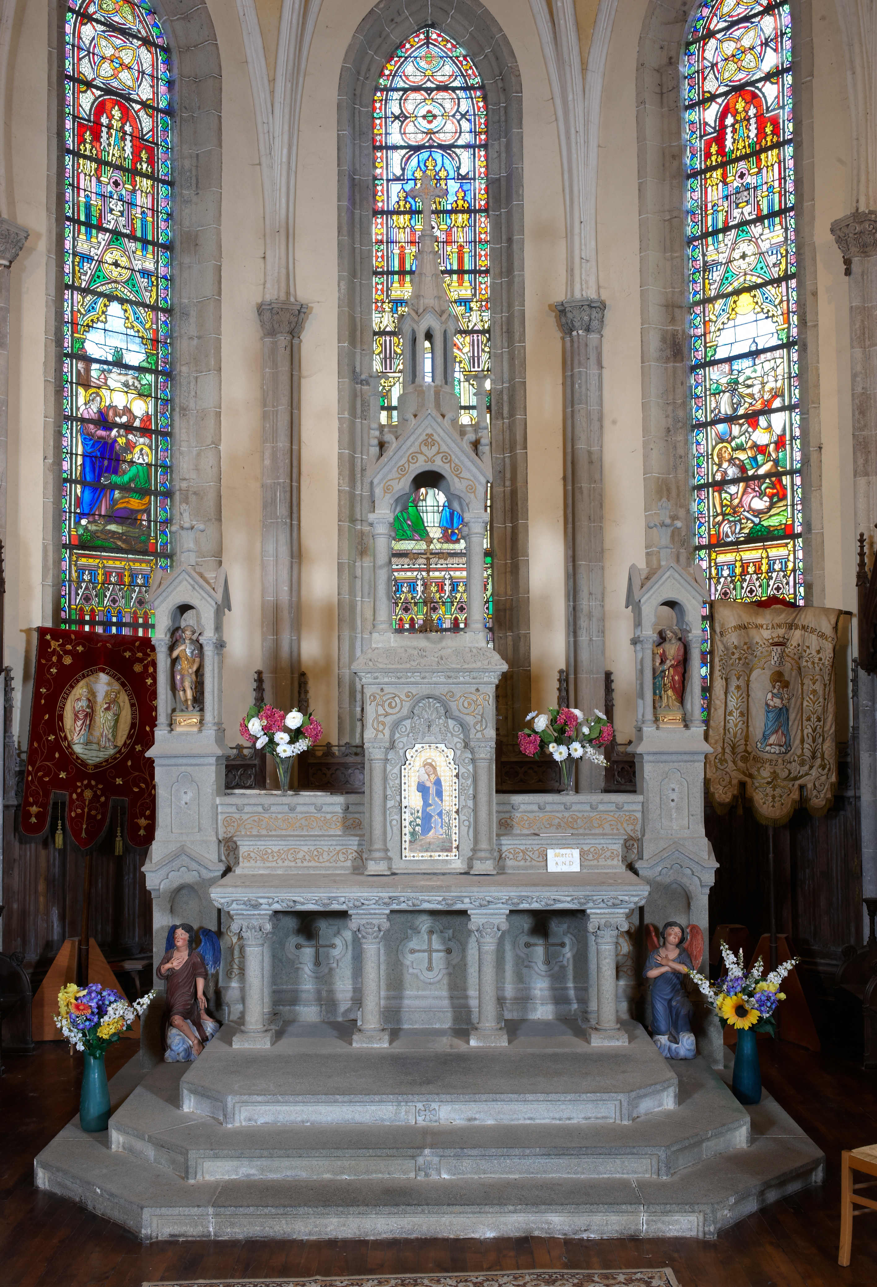 Rospez, le bourg : église paroissiale, maitre-autel de type Hernot en granite gris. Les deux statues d'anges en bois de part et d'autre de l'autel sont datables du 18e siècleImmatriculation