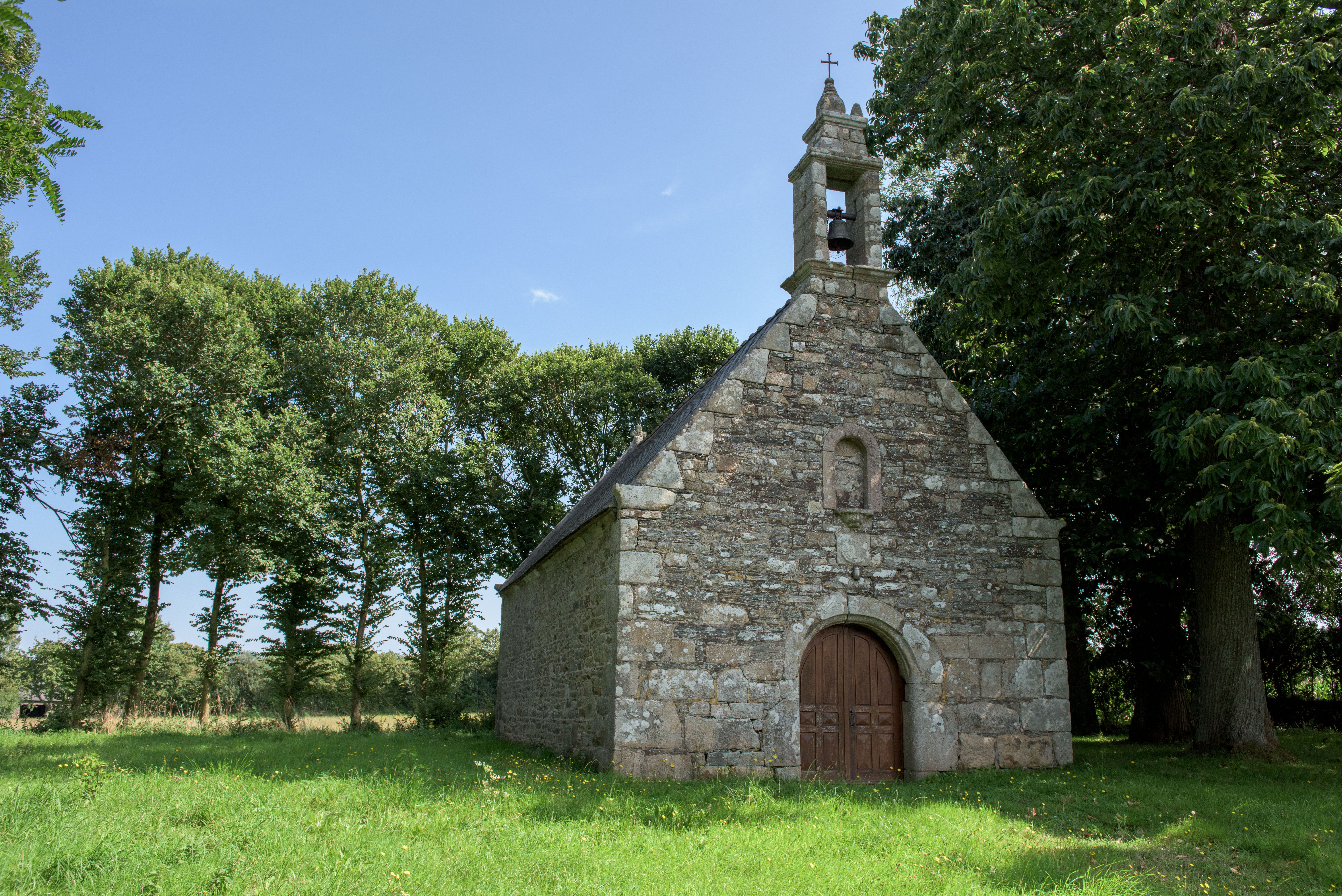 Rospez : chapelle Saint-Dogmaël. L'édifice est entouré par un talus planté d'arbre, délimitant le placître ou enclosImmatriculation