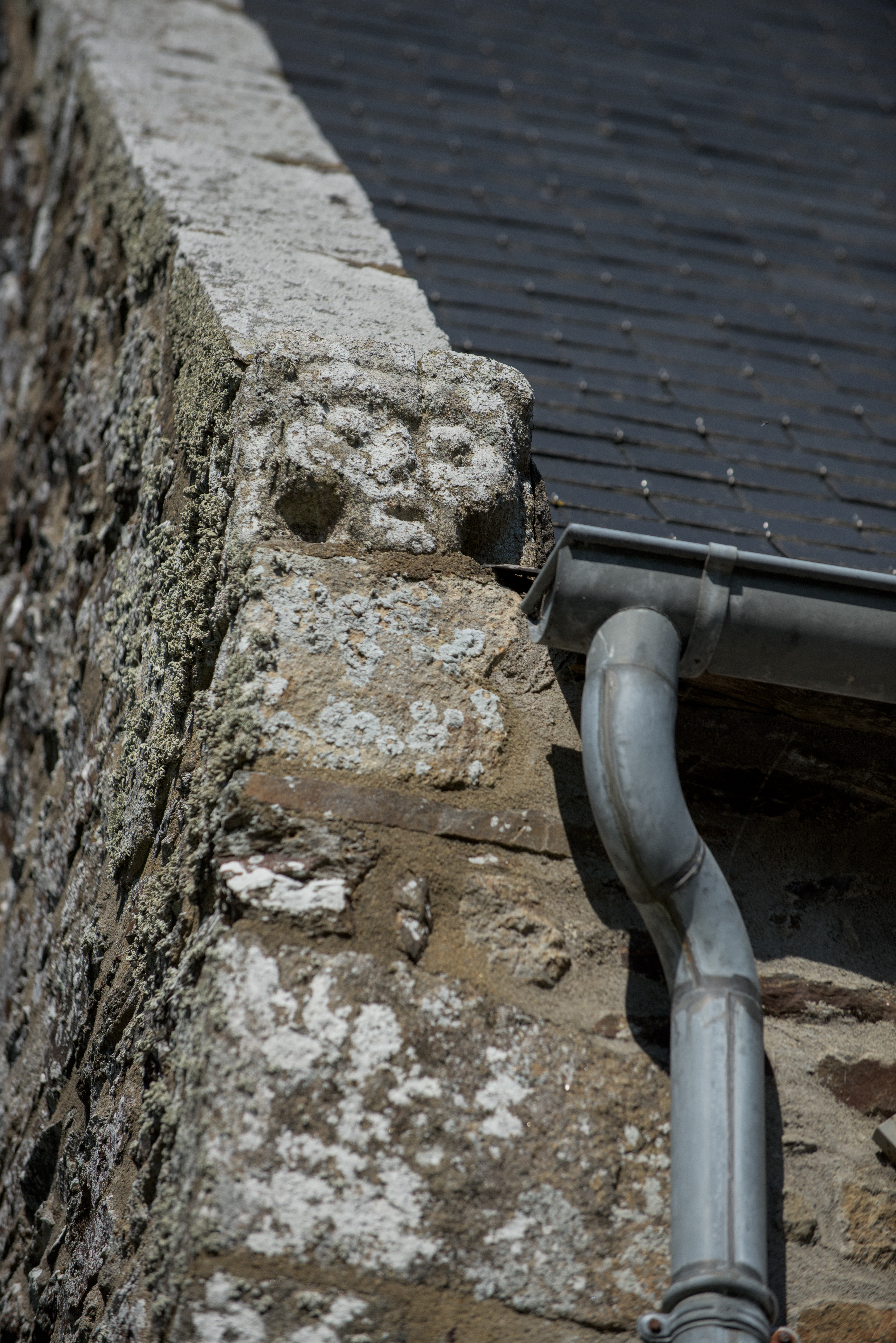 Manoir de la Herviais, détail d'un rampant du pignon avec crossette sculptée d'une têteImmatriculation