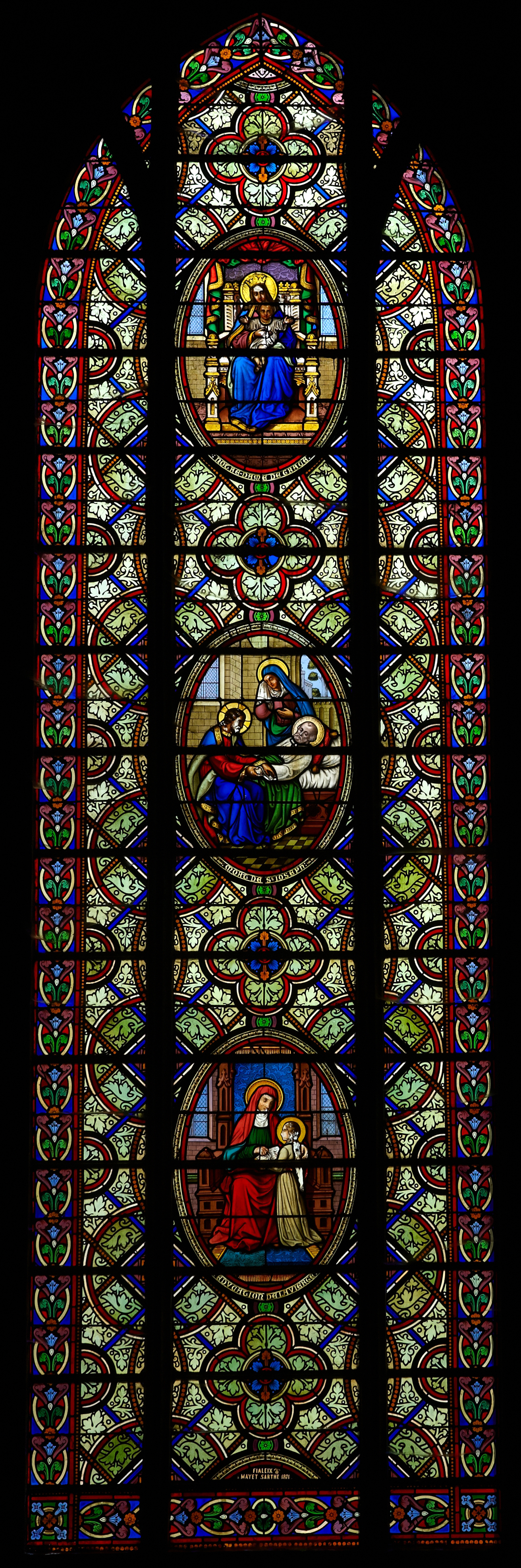 Rospez, le bourg : église paroissiale, vitrail représentant Notre-Dame de Grâce, la mort de saint Joseph et l'éducation de la ViergeImmatriculation